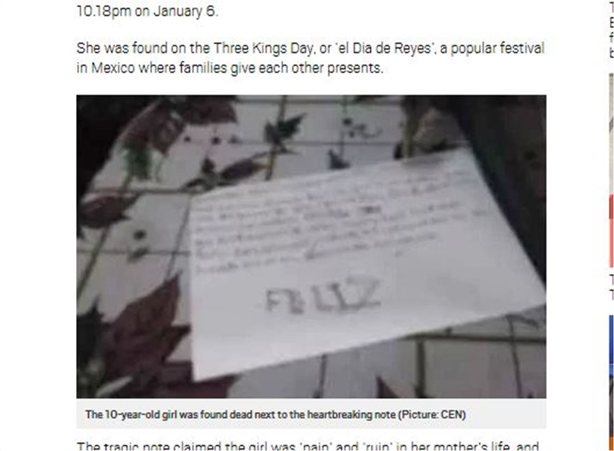 Η 6η Ιανουαρίου είναι η «Dia de Reyes» (σ.σ η μέρα των τριών βασιλιάδων) και τα μέλη των οικογενειών ανταλλάζουν δώρα μεταξύ τους. Στις 10.18 λοιπόν οι αρχές του Αγουασκαλιέντες έλαβαν τηλεφώνημα για ένα κοριτσάκι που είχε κρεμαστεί και όταν έφτασαν στο σημείο, βρήκαν και ένα σημείωμα στο οποίο η μικρή εξηγούσε τους λόγους της απόφασης της. Η ιατροδικαστική έρευνα έδειξε ως αιτία θανάτου τον πνιγμό, ενώ η μητέρα της 10χρονης αναζητείται, καθώς είναι εξαφανισμένη. Οι γείτονες πάντως, έλεγαν πως η μικρή δεν έδειχνε να αντιμετωπίζει κάποιο πρόβλημα ή να είναι θλιμμένη. Ουδείς όμως μπορεί να γνωρίζει τι συμβαίνει στο μυαλό και στην καρδιά ενός μικρού παιδιού.