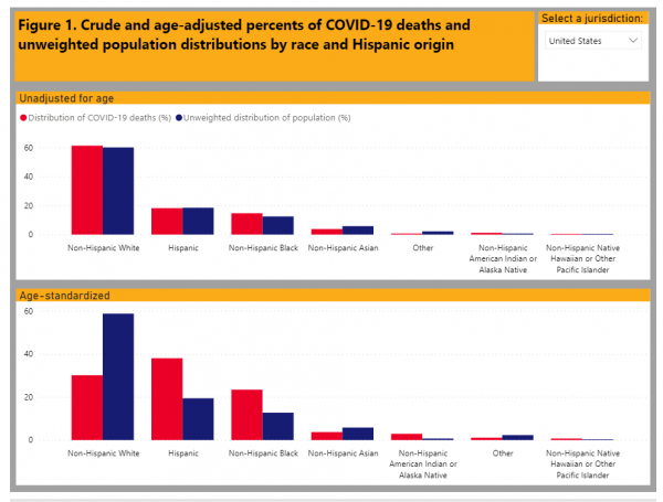 Το CDC διαπιστώνει, μάλιστα, πως «η διαφορά είναι ακόμη μεγαλύτερη όταν τα ποσοστά προσαρμόζονται στα ηλικιακά δεδομένα (με βάση τις διαφορές στην ηλικιακή κατανομή ανάμεσα στις διάφορες φυλετικές ή εθνοτικές ομάδες)». Με βάση αυτή τη δεύτερη αλλά εξαιρετικά κρίσιμη διευκρίνιση και τον σχετικό πίνακα προκύπτει πως όσον αφορά στους Λατίνους, ενώ το ποσοστό τους στον πληθυσμό ανέρχεται στο 19,4%, από τις τάξεις τους προέρχεται το 38% των θανάτων. Κάτι ανάλογο συμβαίνει και με τους μαύρους, με την πληθυσμιακή αναλογία τους να είναι 12,7% και το μερίδιό τους στους θανάτους 23,4%.
