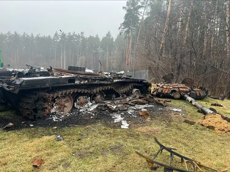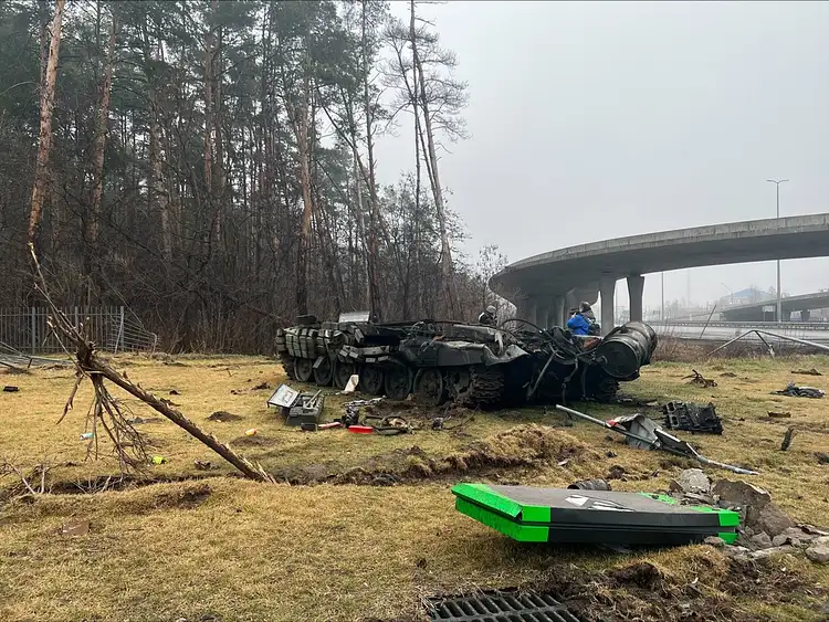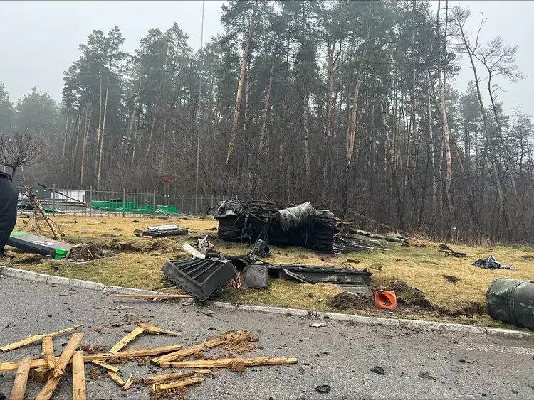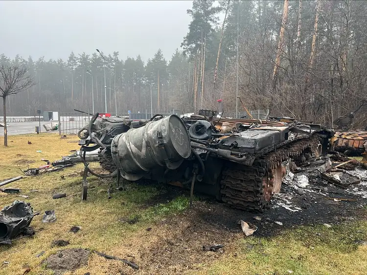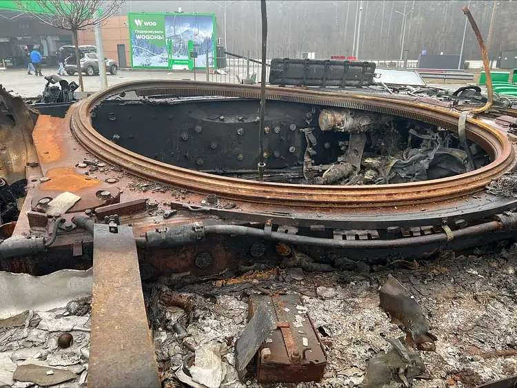Σκελετοί των τανκς ανάμεσα στα σπίτια, τις αυλές, τους ανθρώπους που απέμειναν να κοιτούν την καταστροφή. Πάνω στο χώμα τα υπολείμματα μιας στολής και ένα κράνος. Ανήκε σε έναν νεαρό στρατιώτη. Ηταν Ρώσος. Ο καπνός και η μυρωδιά του καμένου μας προσγειώνουν στην πραγματικότητα. Η μάχη έλαβε χώρα πριν από λίγες ώρες. Με απόγνωση στο πρόσωπο οι κάτοικοι κοιτούν τα αποκαϊδια. Κατεστραμμένες στέγες, γκρεμισμένα σπίτια, διαλυμένες ζωές.