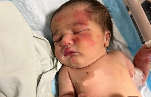 Εικόνες που δημοσιεύτηκαν στα μέσα κοινωνικής δικτύωσης δείχνουν το μωρό, που φαίνεται να είναι περίπου 4 μηνών, να έχει μώλωπες στο πρόσωπο και το σώμα του.