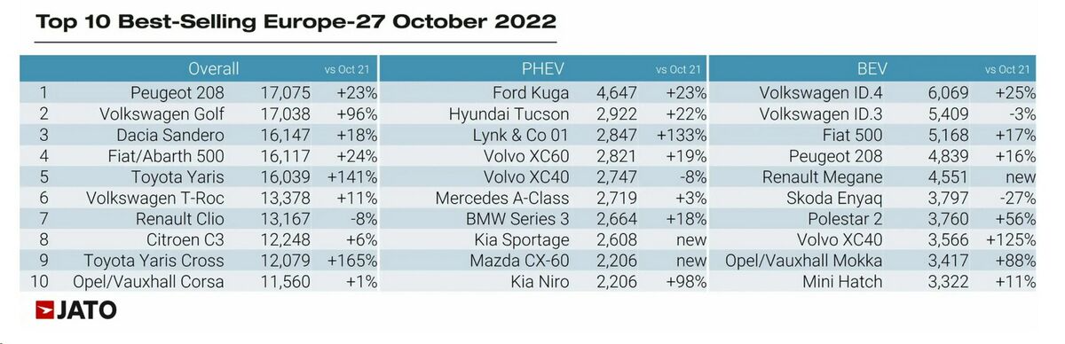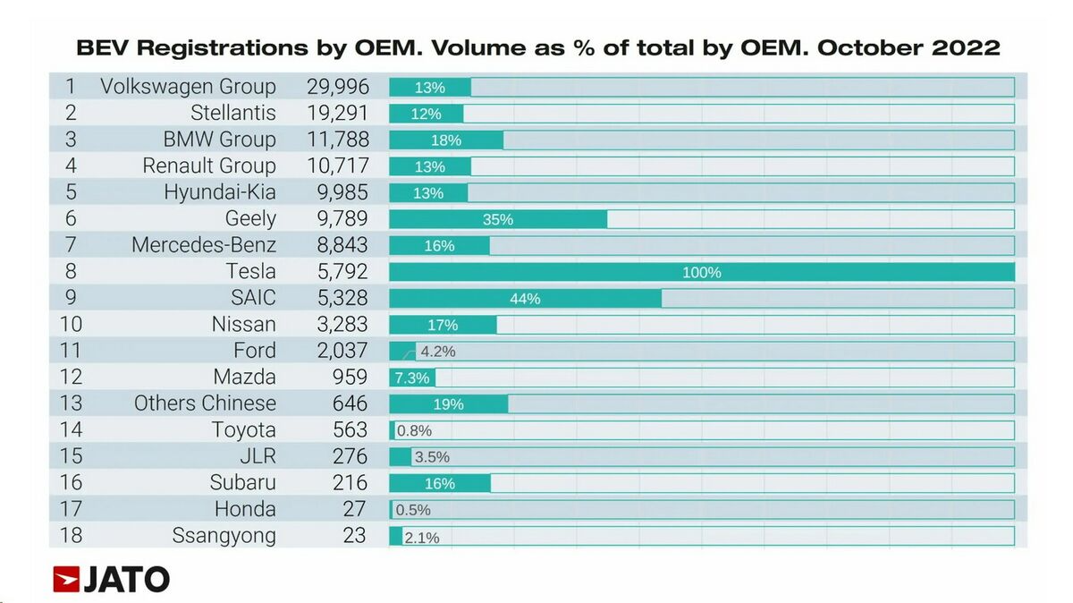 Ποιοι είναι όμως οι κατασκευαστές που πωλούν τα πιο πολλά ΒEVs; Με βάση λοιπόν τα στοιχεία της Jato πρώτος σε πωλήσεις είναι ο όμιλος Volkswagen, με τις μάρκες του VW, Audi, Skoda, Porsche και Cupra που κατά τον Οκτώβριο πούλησαν συνολικά 29.996 αυτοκίνητα. Που αντιστοιχούν στο 25% της αγοράς, ενώ από τις μεμονωμένες μάρκες η πιο δημοφιλής είναι η μάρκα VW. H οποία έχει μερίδιο αγοράς 12,7%.