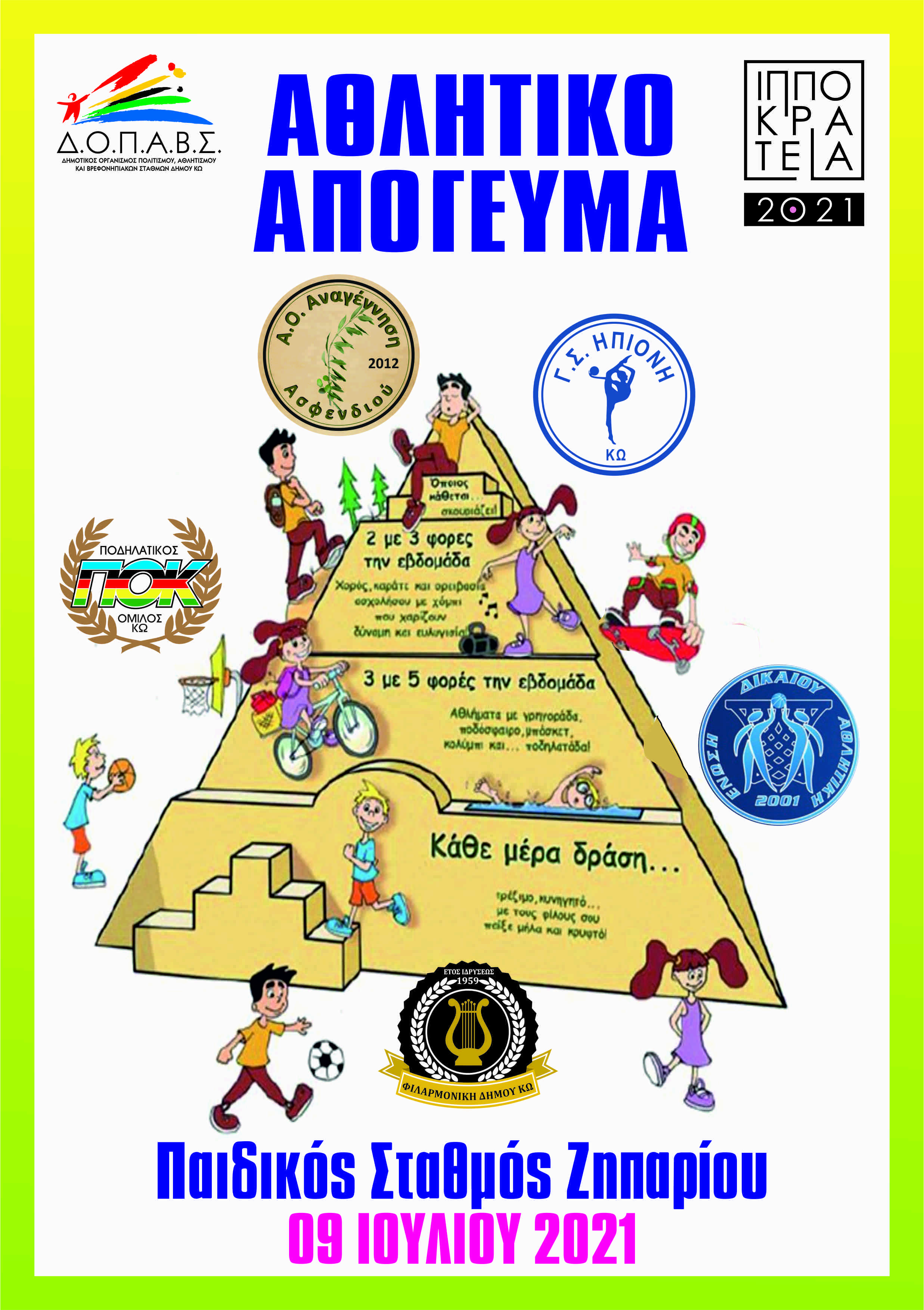 Ο Παιδικός Σταθμός Ζηπαρίου, σε συνεργασία με το τμήμα Αθλητισμού του Δ.Ο.Π.Α.Β.Σ. και με τέσσερα Αθλητικά σωματεία του νησιού, διοργανώνει ένα απόγευμα γνωριμίας αθλημάτων.