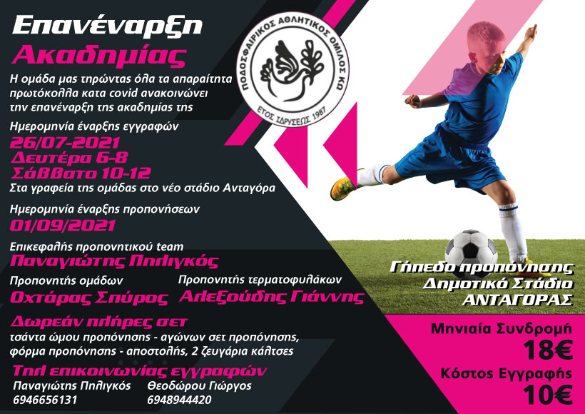 Η ομάδα του ΠΑΟΚ Κω , τηρώντας όλα τα απαραίτητα πρωτόκολλα κατά του covid , ανακοινώνει την επανέναρξη της ακαδημίας της. Η ημερομηνία έναρξης των εγγραφών είναι η 26η Ιουλίου και θα γίνονται κάθε Δευτέρα 18:00-20:00 και κάθε Σάββατο 10:00-12:00, στα γραφεία της ομάδας στο νέο στάδιο Ανταγόρα. Το γήπεδο των προπονήσεων θα είναι το παλαιό Ανταγόρας όπου από 1η Σεπτέμβρη θα ανοίξει τις πόρτες του ξανά να υποδεχθεί αθλητές μετά από πολύ καιρό. Μαζί με την εγγραφή το κάθε παιδί θα λαμβάνει δωρεάν πλήρες σετ τσάντας ώμου, φόρμα προπόνησης-αποστολής και δύο ζευγάρια κάλτσες.