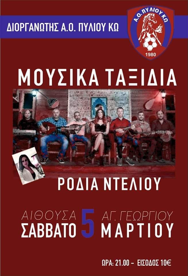 Μουσική βραδιά διοργανώνει η ομάδα του Α.Ο Πυλίου το Σάββατο 5 Μαρτίου στις 21:00 στην αίθουσα του Αγίου Γεωργίου στο Πυλί.