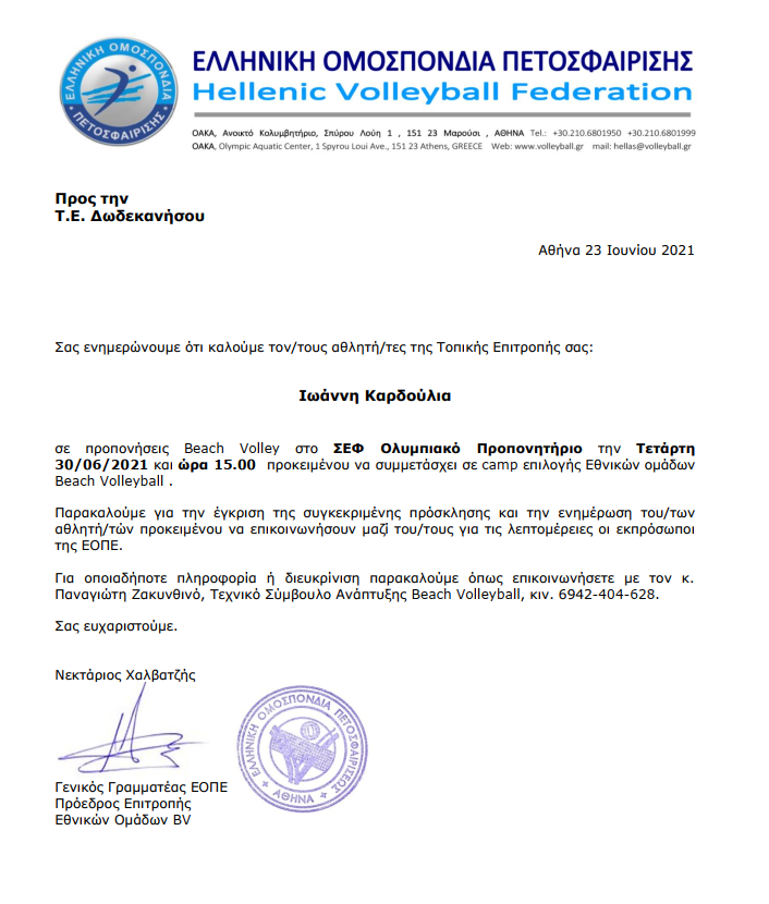 Με μεγάλη χαρά και ικανοποίηση, δέχθηκε ο σύλλογός μας την πρόσκληση που έλαβε από την ΕΟΠΕ για τον αθλητή της ομάδας βόλεϊ Ιωάννη Καρδούλα, προκειμένου να συμμετάσχει σε camp επιλογής της Εθνικής μας ομάδας μπιτς βόλεϊ Κ18.