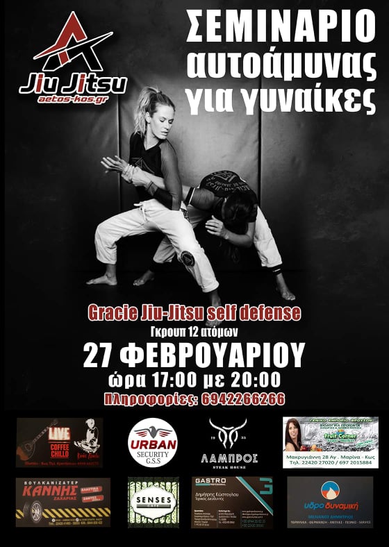 Ο αθλητικός πολιτιστικός Σύλλογος «Αετός Κω», διοργανώνει ένα μοναδικό σεμινάριο αυτοάμυνας, αποκλειστικά, για γυναίκες. Το σεμινάριο είναι δωρεάν, διδάσκεται σε όλο τον κόσμο και είναι εμπνευσμένο από τους αδελφούς Gracie (Gracie Self defence), ενώ δεν απαιτεί ιδιαίτερες γνώσεις στον ασκούμενο κατά την πρώτη του επαφή. Θα είναι ιδιαίτερη χαρά να μοιραστούμε μαζί σας γνώσεις και να δείτε σε μία δύσκολη στιγμή απειλής, πως η απεμπλοκή και η αποκλιμάκωση είναι το παν, σε αντίθεση με τον πανικό και την άγνοια.
