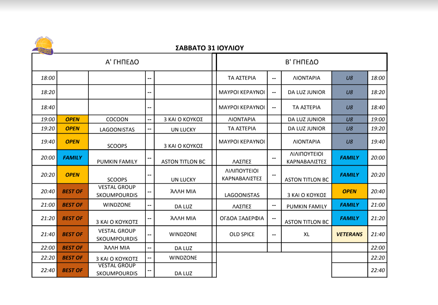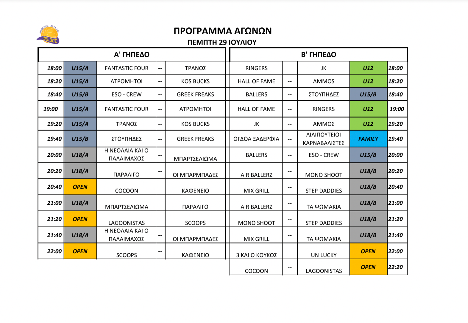 Αναλυτικά, το πλήρες πρόγραμμα του τουρνουά, που έχει γίνει θεσμός πλέον στην Κω και περιλαμβάνει πολλά παιχνίδια σε διαφορετικές κατηγορίες.