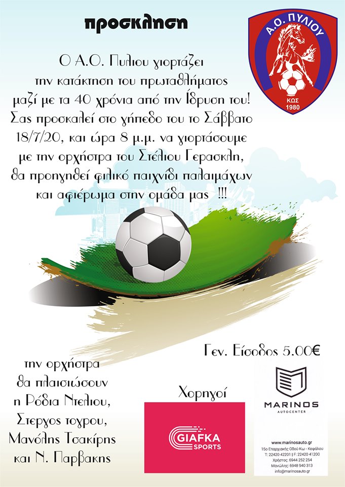 Ο Α.Ο Πυλίου γιορτάζει την κατάκτηση του πρωταθλήματος μαζί με τα 40 χρόνια από την ίδρυση του και σας προσκαλεί στο γήπεδο του το Σάββατο 18/7/20 και ώρα 20:00 να γιορτάσουμε με την ορχήστρα του Στέλιου Γερασκλή.