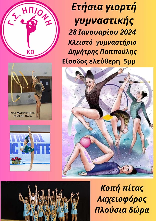Κατά τη διάρκεια της εκδήλωσης θα γίνει η κοπή της πίτας του Συλλόγου μας καθώς και βραβεύσεις αθλητριών με κύρια την βράβευση της Πρωταθλήτριας μας στο Πανελλήνιο Σχολικό Πρωτάθλημα Ρυθμικής κατηγορίας Γυναικών 2023 .