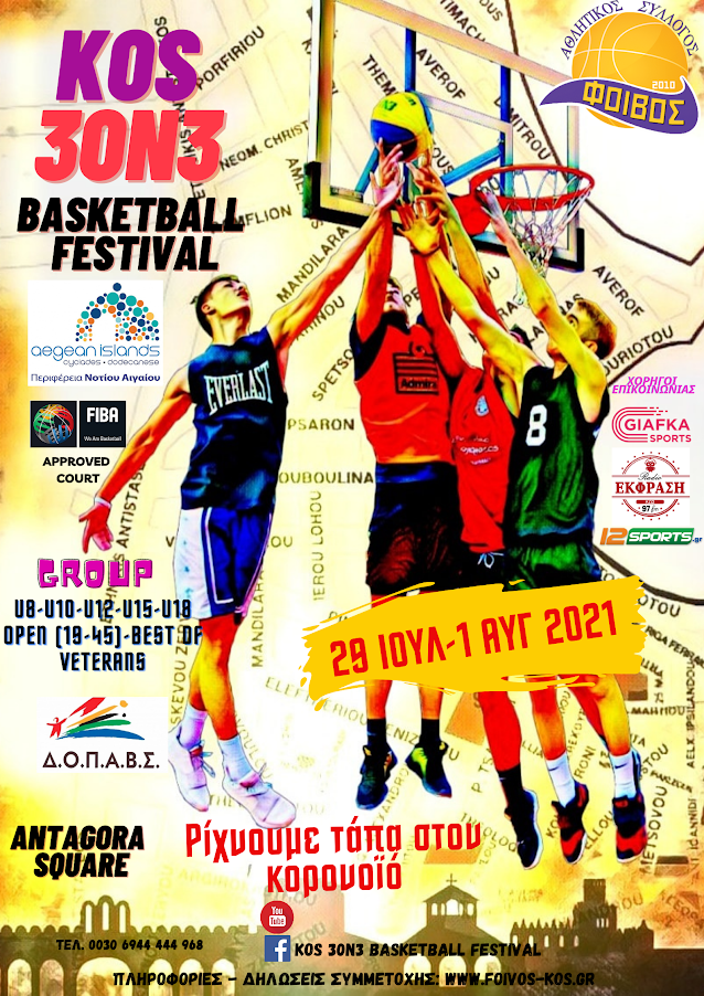 Η αντίστροφη μέτρηση για το 4ο Kos 3on3 Basketball Festival έχει ξεκινήσει… Ο Α.Σ. Φοίβος Κω με τη στήριξη της Περιφέρειας Νοτίου Αιγαίου και του Δ.Ο.Π.Α.Β.Σ. Κω διοργανώνει από 29 Ιουλίου έως 1 Αυγούστου το ετήσιο και καθιερωμένο πλέον τουρνουά 3on3, στην πλατεία Ανταγόρα της Κω. Οι δηλώσεις συμμετοχής θα γίνονται δεκτές μέχρι και τις 27 Ιουλίου και ο Α.Σ. Φοίβος προσκαλεί στην Κω όλους τους αθλητές (αγόρια και κορίτσια) ηλικίας από 8 ετών μέχρι και «βετεράνους» (45+), που θέλουν να παίξουν και να απολαύσουν το μπάσκετ.