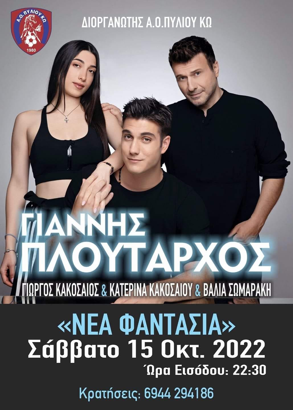 Μία ημερομηνία που θα κρατήσουμε όλοι καθώς ένας από τους μεγαλύτερους λαϊκούς καλλιτέχνες των τελευταίων δεκαετιών ο Γιάννης Πλούταρχος έρχεται για μία μοναδική βραδιά στη Νέα Φαντασία. Με αφορμή την συμμετοχή του ΑΟ Πυλίου στην Γ Εθνική για 3η χρονιά, η διοίκηση της ομάδας γιορτάζει με τους φιλάθλους της και ετοιμάζει μία βραδιά στις 15 Οκτωβρίου που θα μας μείνει αξέχαστη.