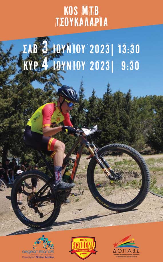 Ο Αθλητικός Όμιλος Ακαδημία Κω, το Σάββατο 3 και την Κυριακή 4 Ιουνίου, διοργανώνει διασυλλογικό αγώνα ορεινής ποδηλασίας με τη στήριξη της Περιφέρειας Νοτίου Αιγαίου και του Δ.Ο.Π.Α.Β.Σ., με την επωνυμία «KOS MTB#1 - 2023», στην περιοχή της Παναγιάς Τσουκαλαριάς, για τις αγωνιστικές κατηγορίες των Εφήβων, Νεανίδων, Παίδων, Κορασίδων, Παμπαίδων, Παγκορασίδων, Μίνι και Super Μίνι.