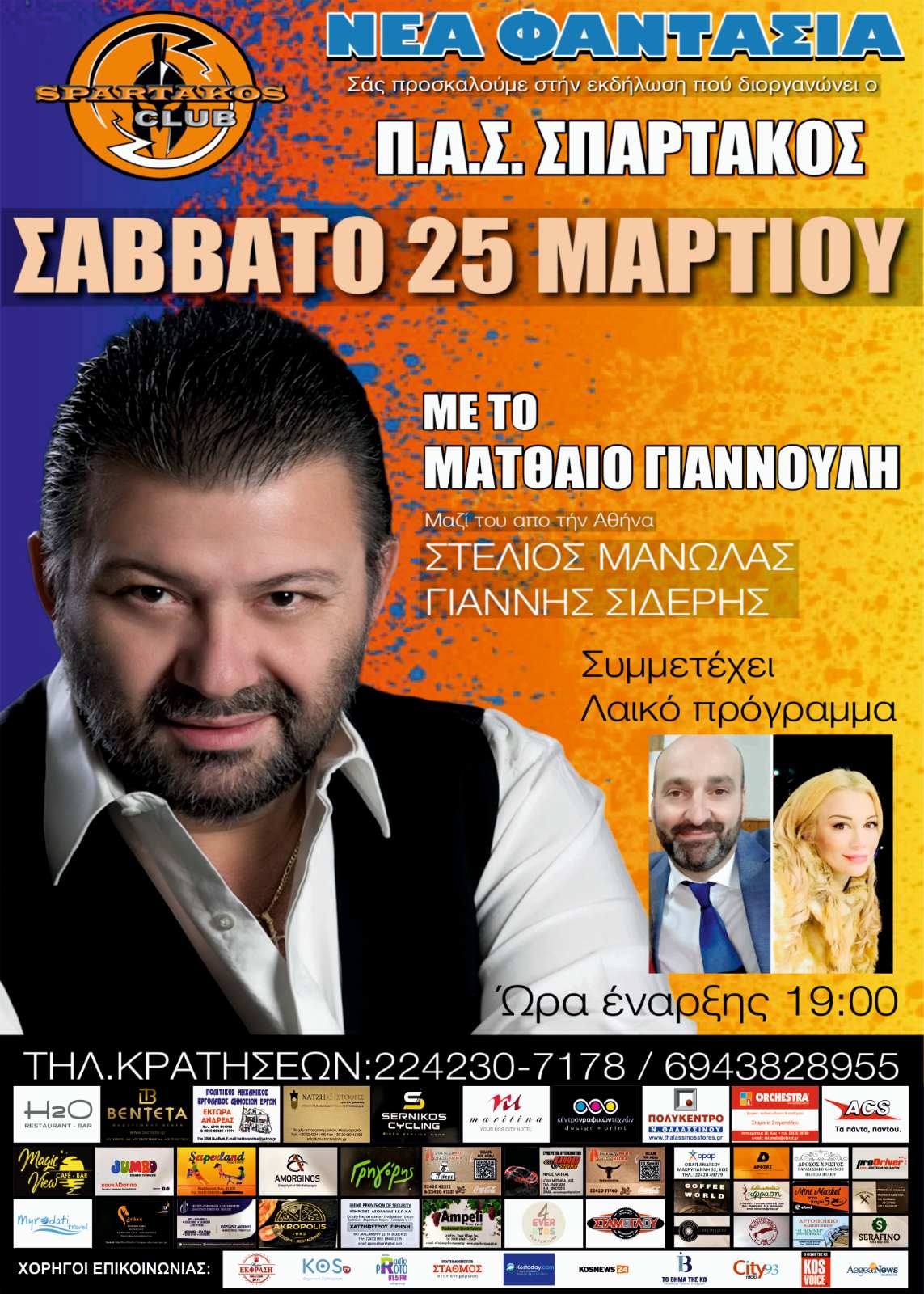 Εκδήλωση με τον γνωστό καλλιτέχνη Ματθαίο Γιαννούλη, διοργανώνει στις 25/3, ο αθλητικό Σύλλογος Σπάρτακος.