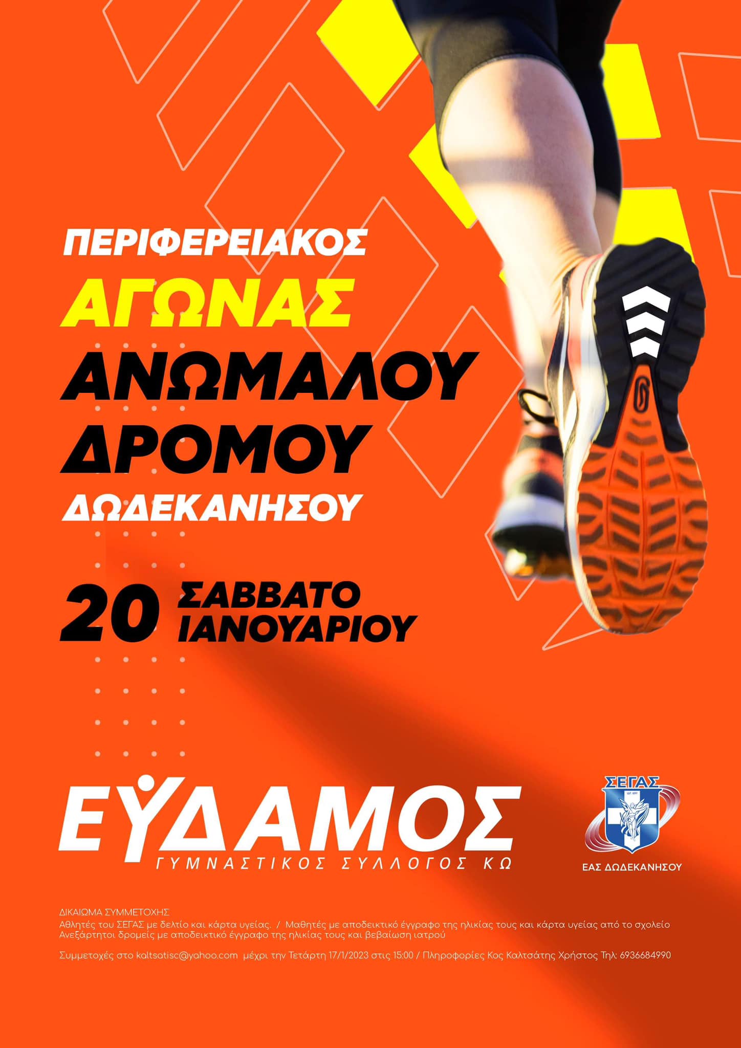 Ο ΕΑΣ ΣΕΓΑΣ Δωδεκανήσου και ο Γ.Σ. Εύδαμος Κω σας ενημερώνουν ότι το Σάββατο 20 Ιανουαρίου διοργανώνεται Περιφερειακός Αγώνας Ανωμάλου Δρόμου Δωδεκανήσου, στον υδροβιότοπο Κω, με τα κάτωθι αγωνίσματα.