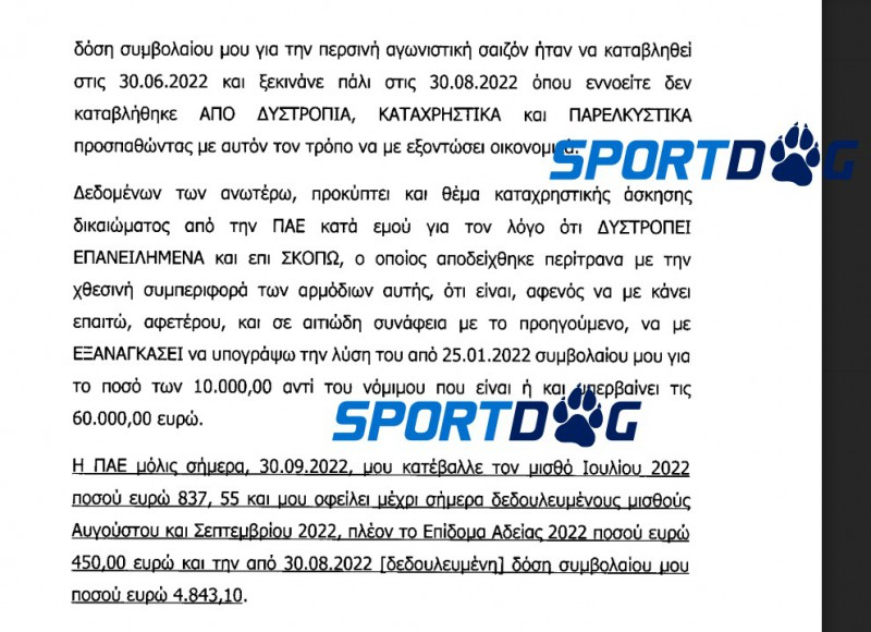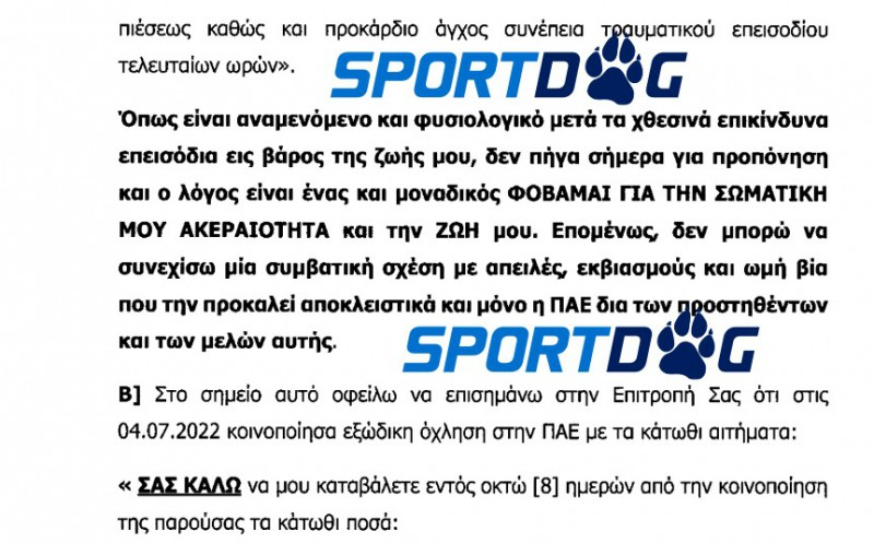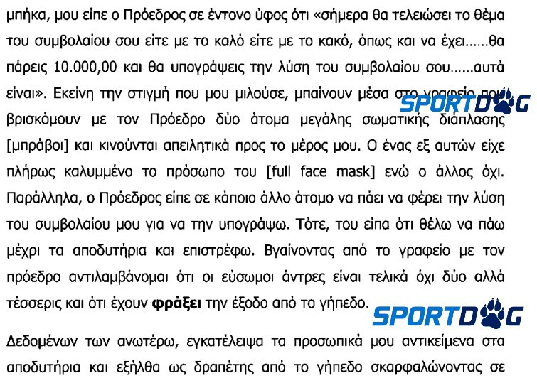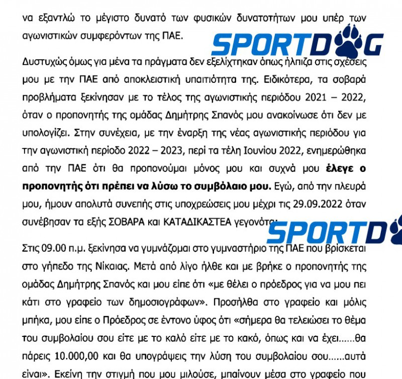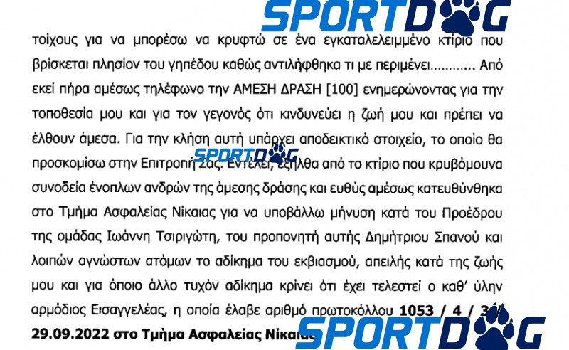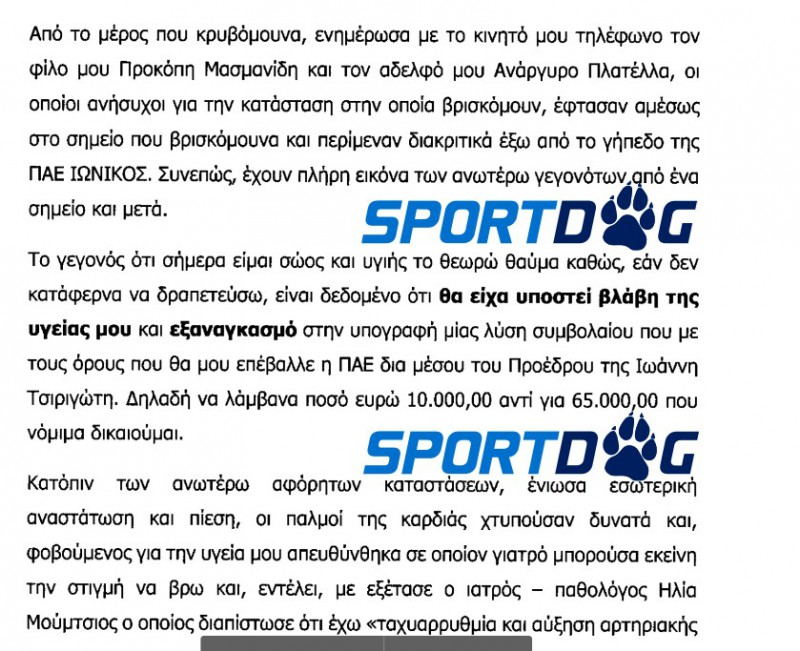 Στην καταγγελία του ο έμπειρος μέσος ισχυρίζεται ότι χθες (29/9) (όπως σας είχε ενημερώσει το Sportdog.gr... φωτογραφίζοντας τον) ο πρόεδρος της Νικαιώτικης ΠΑΕ (δεν αναφέρει το όνομα του), παρουσία δύο μπράβων του είπε ότι θα του δώσει 10.000 ευρώ για να υπογράψει τη λύση του συμβολαίου του. Ο Πλατέλλας, όπως αναφέρεται στην καταγγελία, το «έσκασε» από το γήπεδο της Νίκαιας και πήγε σε ένα εγκαταλελειμμένο κτίριο από το οποίο κάλεσε την αστυνομία για να τον προστατεύσει.