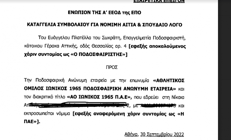 Καταγγελία σοκ έκανε στην Α’ ΕΕΟΔ της ΕΠΟ ο ποδοσφαιριστής Βαγγέλης Πλατέλλας ζητώντας τη λύση του συμβολαίου του «για σπουδαίο λόγο» υπαιτιότητα της ΠΑΕ Ιωνικός, καθώς και να του επιδικαστεί το ποσό των 54.294 ευρώ.