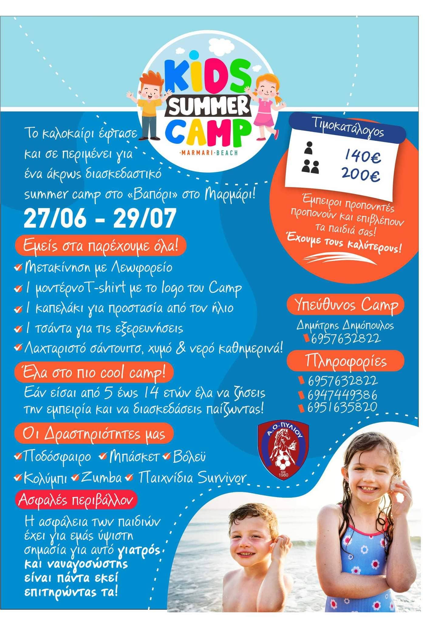 Από 27 Ιουνίου μέχρι και 29 Ιουλίου θα διεξαχθεί το Kids Summer Camp στην παραλία Βαπόρι στο Μαρμάρι με υπεύθυνο τον Δημήτρη Δημόπουλο σε συνεργασία με την ομάδα του Α.Ο Πυλίου.