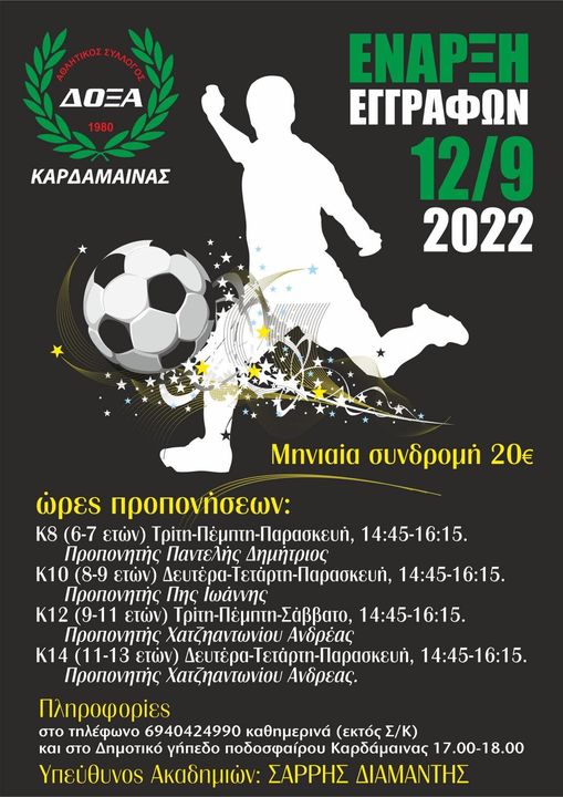 Έναρξη Εγγραφων!!Η Δοξα Καρδαμαινας ξεκινάει τη νέα χρονιά, με μεγάλη διάθεση και αισιοδοξία!Έλα και εσυ στην οικογένεια μας!Ευχόμαστε καλή αγωνιστική χρονιά με υγεία και πολλές επιτυχίες!Σας περιμένουμε όλους