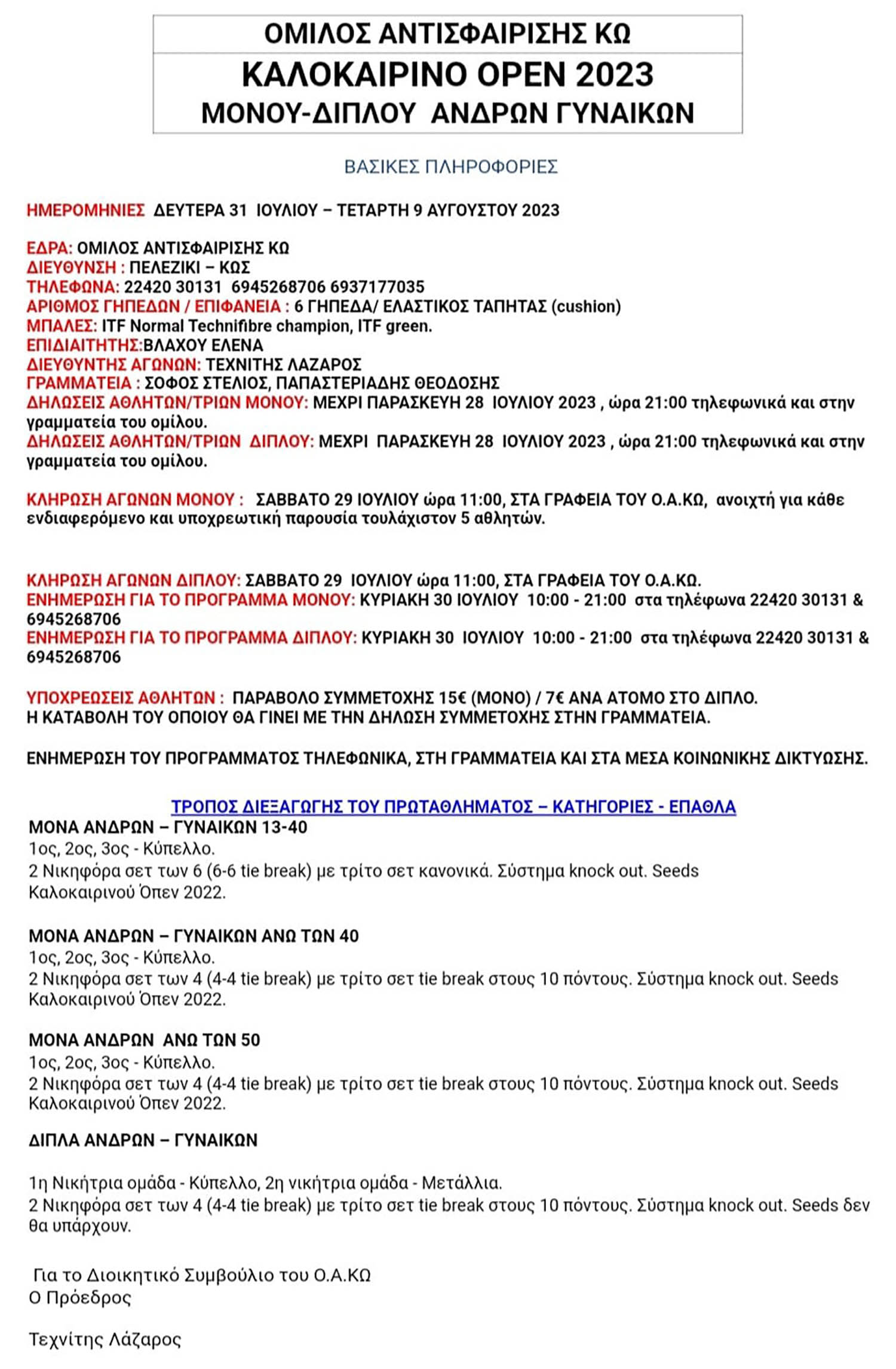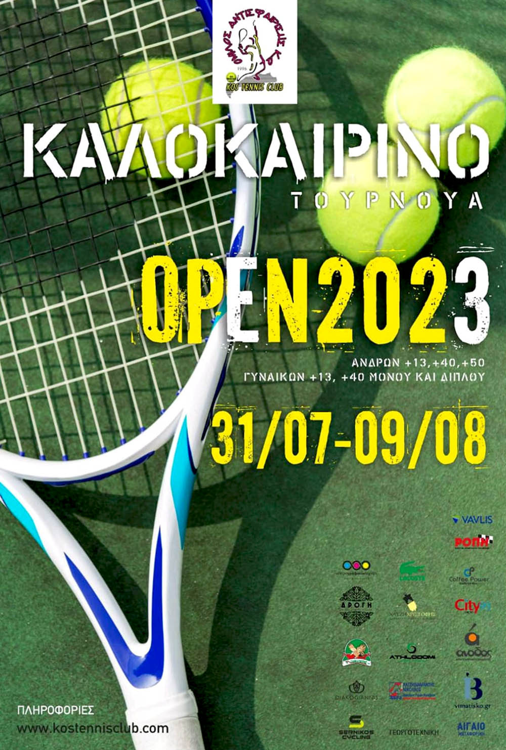 Καλοκαιρινό τουρνουά μονού – διπλού ανδρών και γυναικών, διοργανώνει στις εγκαταστάσεις του ο Όμιλος Αντισφαίρισης Κω, από την Δευτέρα 31 Ιουλίου έως την Τετάρτη 9 Αυγούστου.