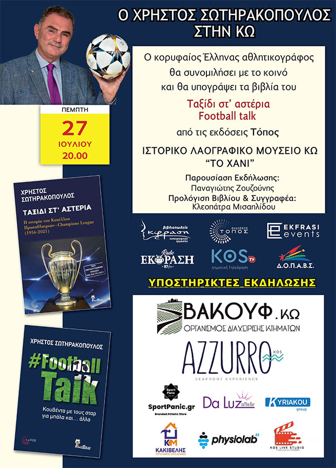 Εκδήλωση για την παρουσίαση των βιβλίων του κορυφαίου Έλληνα αθλητικογράφου Χρήστου Σωτηρακόπουλου με τίτλο ‘’ Ταξίδι στ΄ αστέρια ‘’ Hιστορία του κυπέλλου Πρωταθλητριών – ChampionLeague (1956-2021) και ‘’FOOTBALLTALK’’ Κουβέντα με τους σταρ για μπάλα και…άλλα διοργανώνουν ο ΔΟΠΑΒΣ , οι Εκδόσεις Τόπος και το Βιβλιοπωλείο Έκφραση στα Θερινά Ιπποκράτεια 2023 την Πέμπτη 27 Ιουλίου στις 8 το βράδυ στο Ιστορικό και Λαογραφικό Μουσείο Κω (Χάνι).