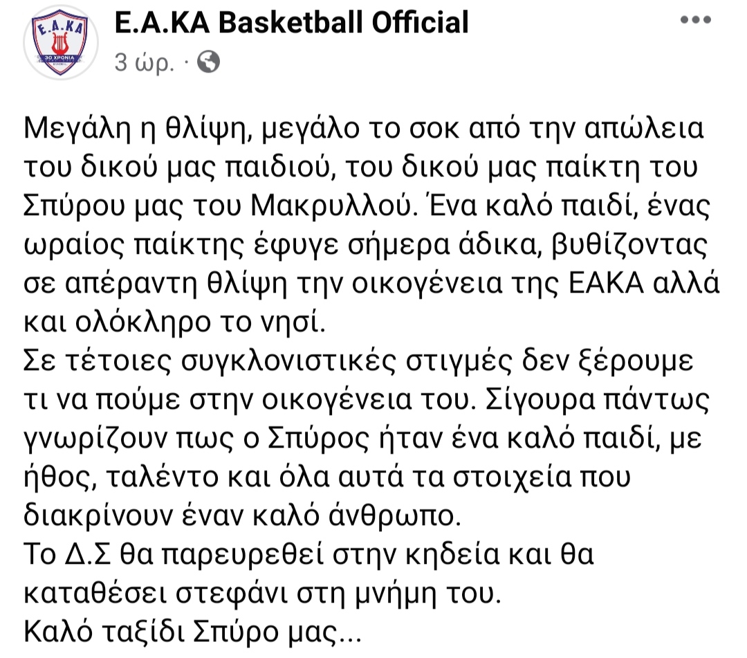 Η απώλεια του αδικοχαμένου Σπύρου, έχει βυθίσει στο πένθος την κοινωνία της Καλύμνου και την οικογένειά του μπάσκετ, καθώς ο Σπύρος ήταν παίκτης της ΕΑΚΑ και διακρίνονταν για το ταλέντο και την αγωνιστικότητα του, όπως αναφέρει στην ανακοίνωση του το σωματείο: