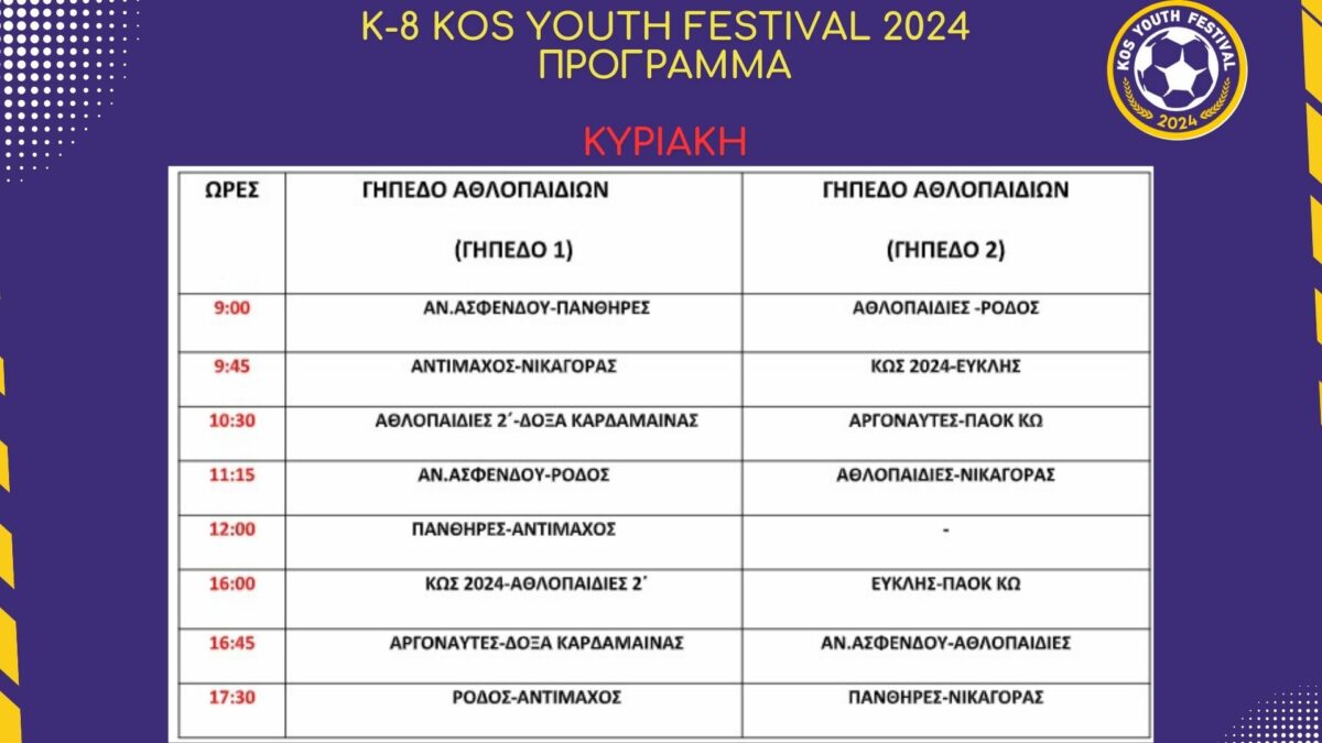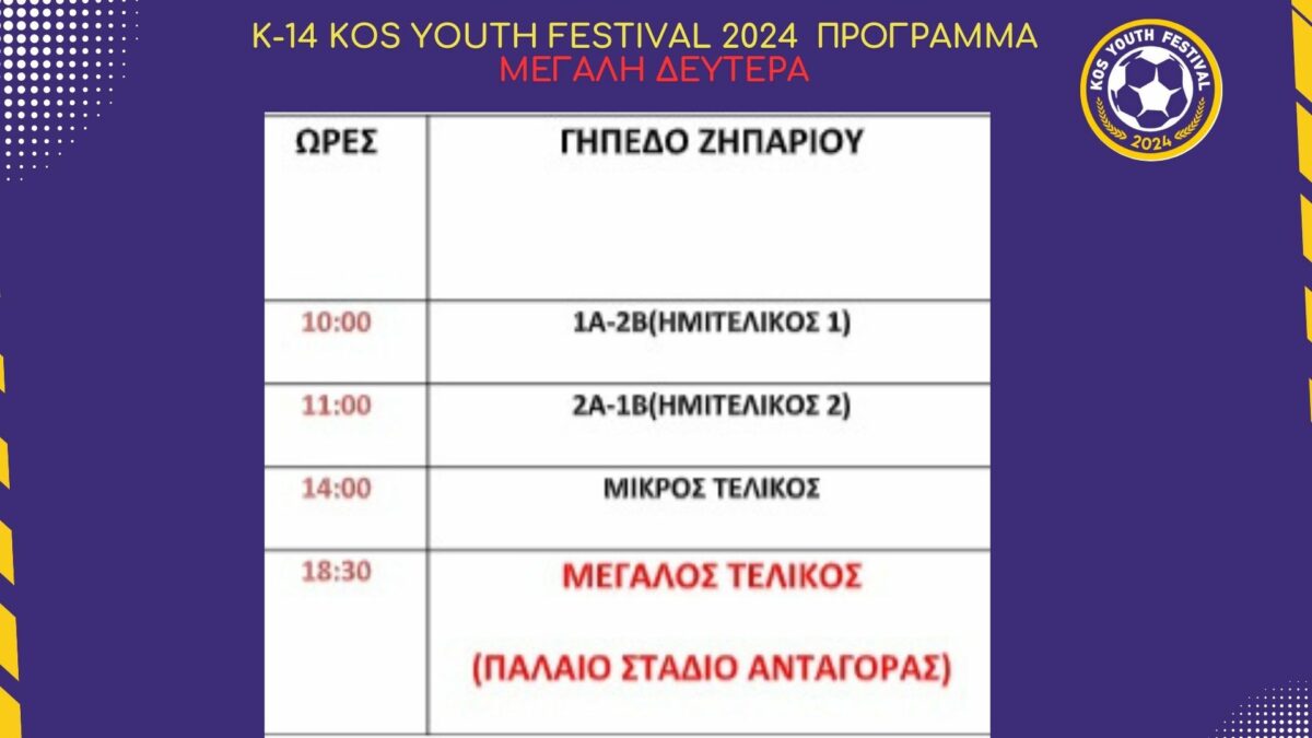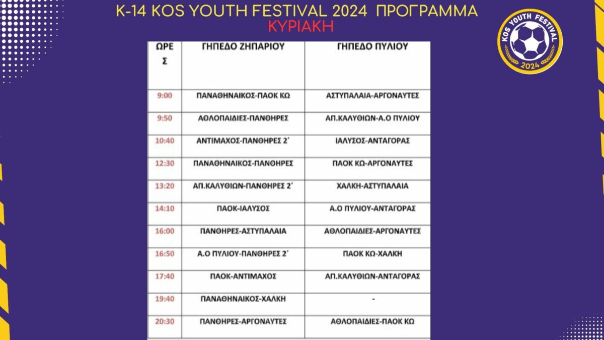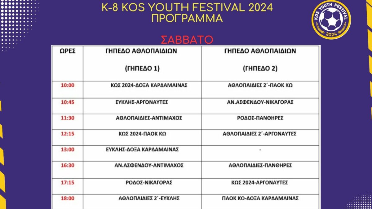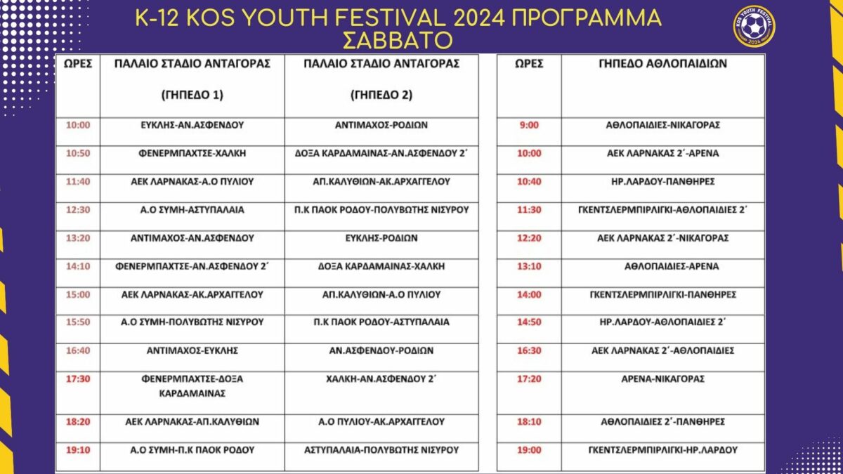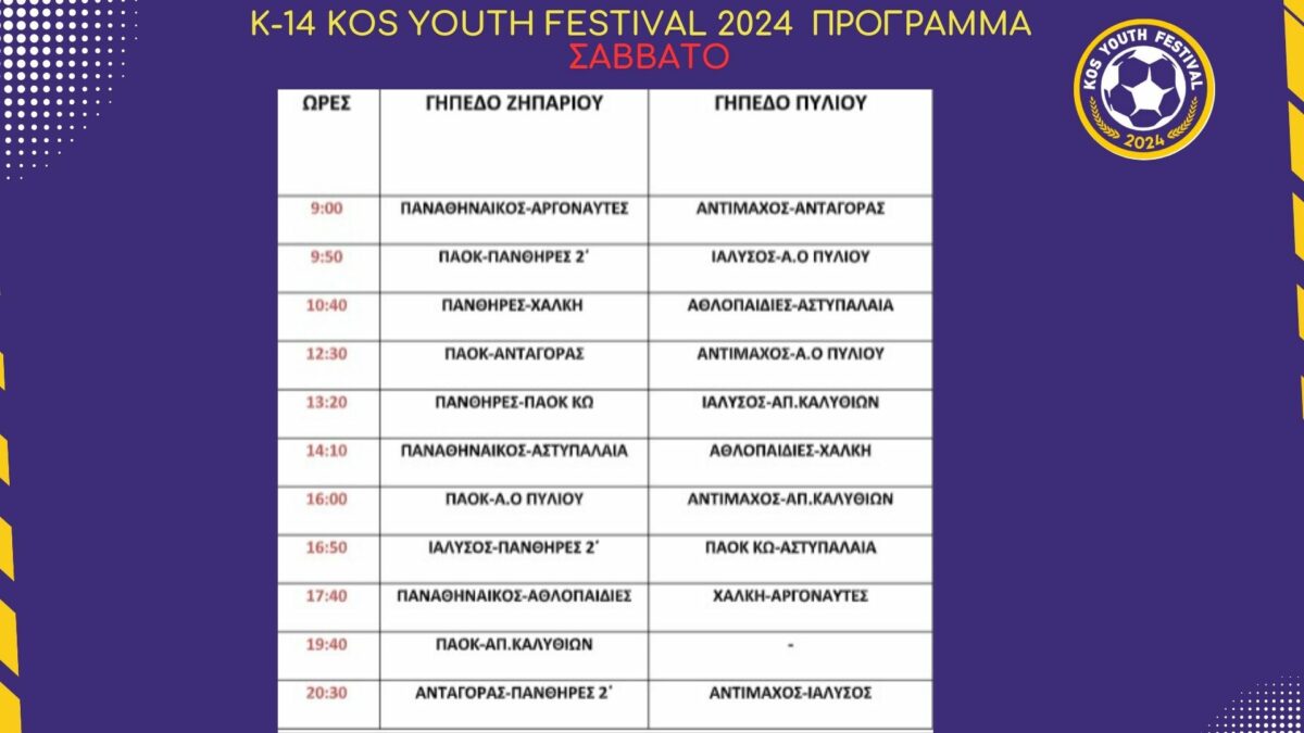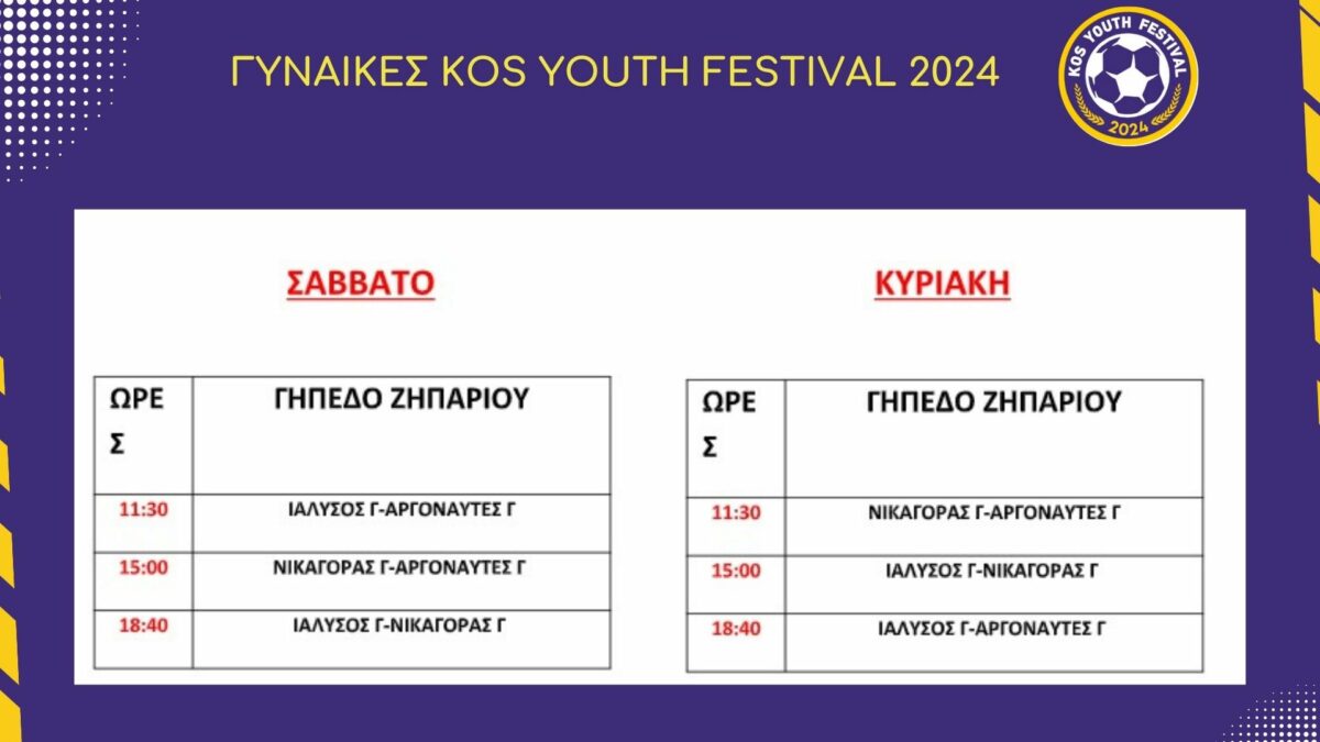 Aνακοινώθηκε απ’ τους διοργανωτές το πρόγραμμα του 3oυ Kos Youth Festival που θα διεξαχθεί στο νησί μας απ’ τις 27 έως τις 29 Απριλίου στις ηλικιακές κατηγορίες Κ-8, Κ-10, Κ-12 και Κ-14 και για το γυναικείο τμήμα.