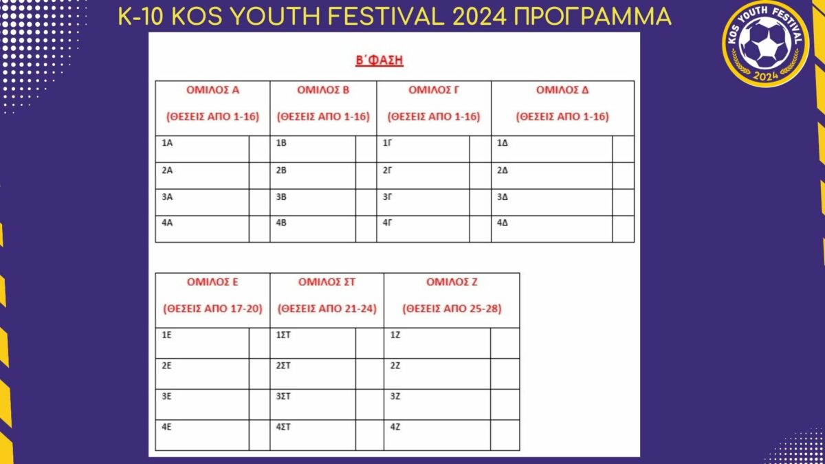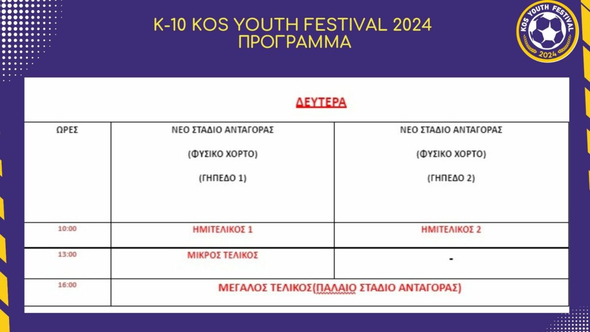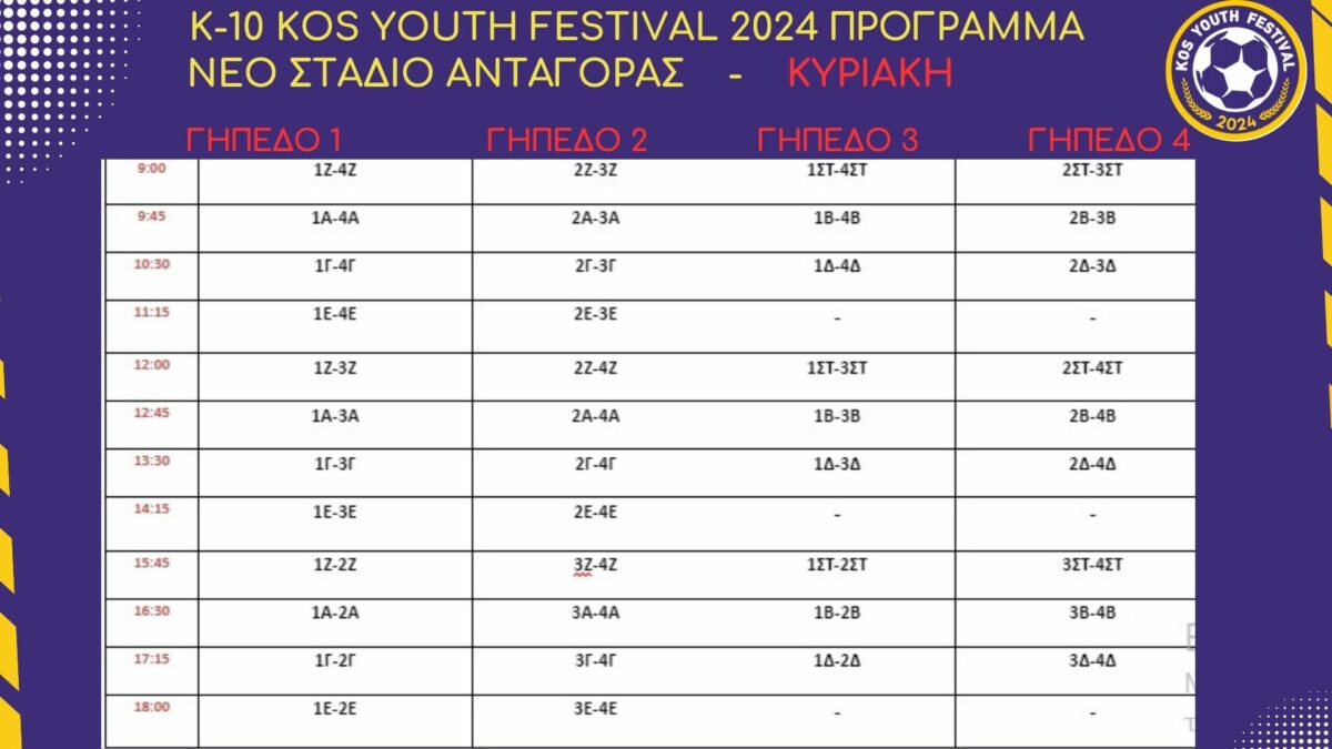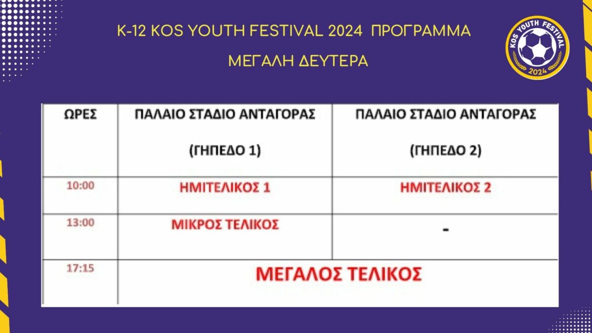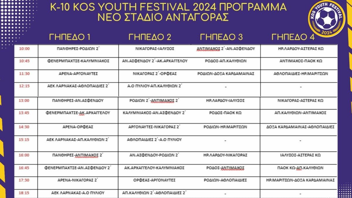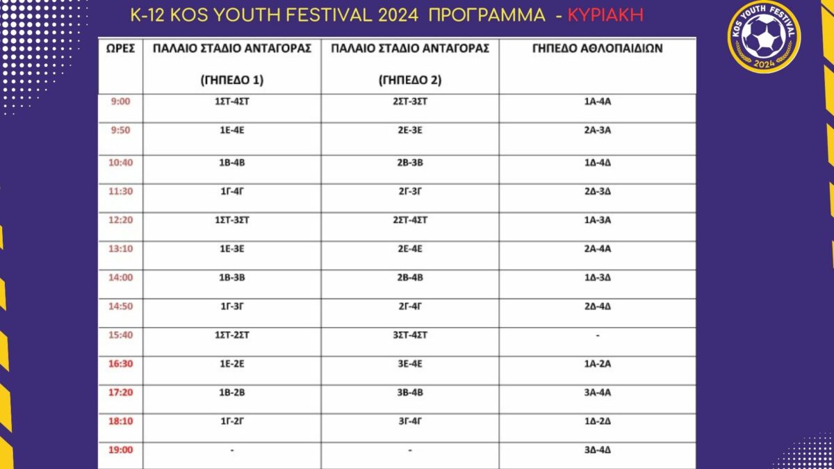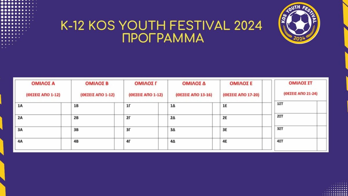 Aνακοινώθηκε απ’ τους διοργανωτές το πρόγραμμα του 3oυ Kos Youth Festival που θα διεξαχθεί στο νησί μας απ’ τις 27 έως τις 29 Απριλίου στις ηλικιακές κατηγορίες Κ-8, Κ-10, Κ-12 και Κ-14 και για το γυναικείο τμήμα.