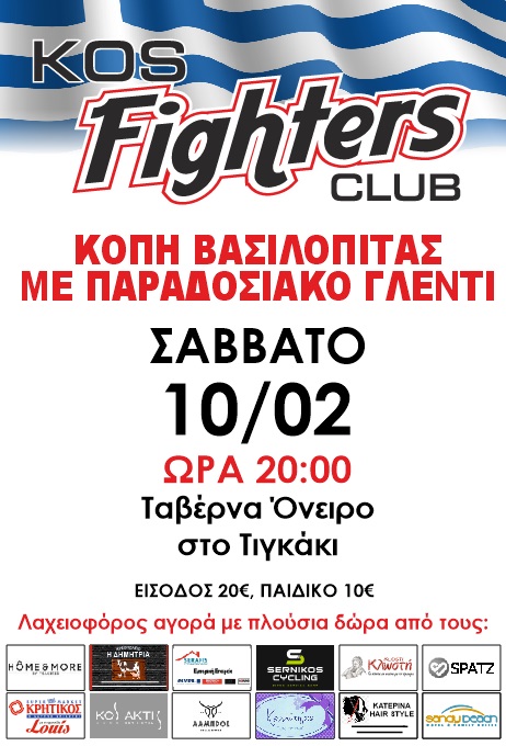 ΤΟ ΔΙΟΙΚΗΤΙΚΟ ΣΥΜΒΟΥΛΙΟ ΤΟΥ ΣΥΛΛΟΓΟΥ " KOS FIGHTERS " ΣΑΣ ΠΡΟΣΚΑΛΕΙ ΣΤΗΝ ΧΟΡΟΕΣΠΕΡΙΔΑ ΠΟΥ ΘΑ ΠΡΑΓΜΑΤΟΠΟΙΗΘΕΊ ΣΑΒΒΑΤΟ 10 ΦΕΒΡΟΥΑΡΙΟΥ 2024 ΣΤΗΝ ΤΑΒΕΡΝΑ "ΟΝΕΙΡΟ" ΣΤΟ ΤΙΓΚΆΚΙ ΚΑΙ ΩΡΑ 20:00.