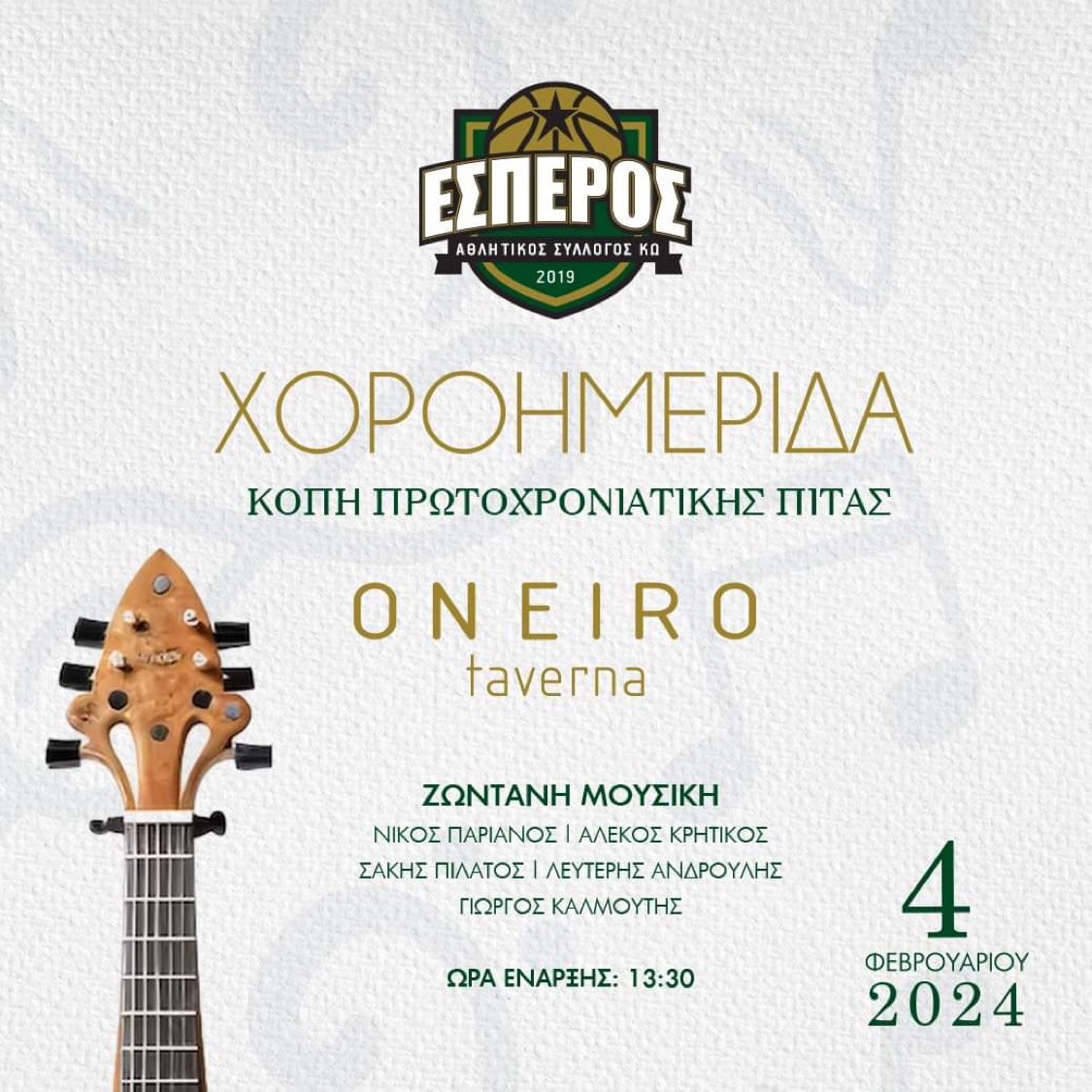 Ο Α.Σ. ΕΣΠΕΡΟΣ Κω σας προσκαλεί στη χοροεσπερίδα που διοργανώνει, την Κυριακή 4 Φεβρουαρίου στις 13:30, στο εστιατόριο Όνειρο, στο Τιγκάκι, όπου θα κόψει την πρωτοχρονιάτικη πίτα…