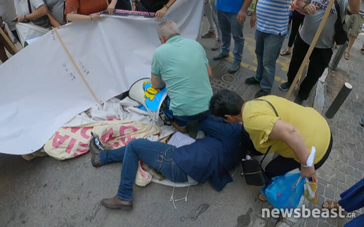 Στην προσπάθεια των διαδηλωτών να «σπάσουν» τη γραμμή των ΜΑΤ που είχε στηθεί έξω από το υπουργείο, ο πρόεδρος της ΠΟΕΔΗΝ, Μιχάλης Γιαννάκος, απωθήθηκε με αποτέλεσμα να πέσει στο έδαφος.