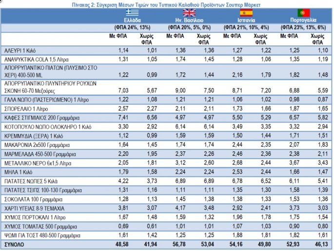 Η σύγκριση των καλαθιών σε αυτή την περίπτωση δείχνει ότι οι τέσσερις χώρες έχουν ακόμα πιο ακριβό μέσο καλάθι από την Ελλάδα, η Ισπανία κατά 19%, η Αγγλία κατά 26% και η Πορτογαλία κατά 10% Αυτό είναι αποτέλεσμα της διαφοράς που έχει ο χαμηλός ΦΠΑ ανά χώρα (πρόκειται για τον ΦΠΑ που αναφέρεται σε τρόφιμα και ποτά). Στην Ελλάδα αυτός ο ΦΠΑ είναι 13% και 24% για συγκεκριμένες κατηγορίες προϊόντων, κάποιες από τις οποίες συμμετέχουν στο δείγμα της έρευνας, όπως είναι τα έλαια, ο καφές, τα γλυκά, τα σνακς και τα αρτοποιήματα. Ο ΦΠΑ είναι σημαντικά υψηλότερος από την Αγγλία (0%) και τη Γαλλία (10% και 5,5%), την Ισπανία (10% και 4%), την Πορτογαλία (13% και 6%), αλλά και τις περισσότερες χώρες της ΕΕ. Η βασική διαφορά είναι ότι τρόφιμα που στην Ελλάδα υπάγονται στον υψηλό συντελεστή ΦΠΑ με 24% στις υπόλοιπες χώρες υπάγονται στον χαμηλό συντελεστή ΦΠΑ, ο οποίος είναι και χαμηλότερος του ελληνικού με 6%, 5,5%, 4% ή ακόμα και 0%. Σημειώνεται ότι η εισαγωγή ειδικών φόρων κατανάλωσης (π.χ. καφές) δεν είναι δυνατόν να συνυπολογιστεί στα παραπάνω στοιχεία.