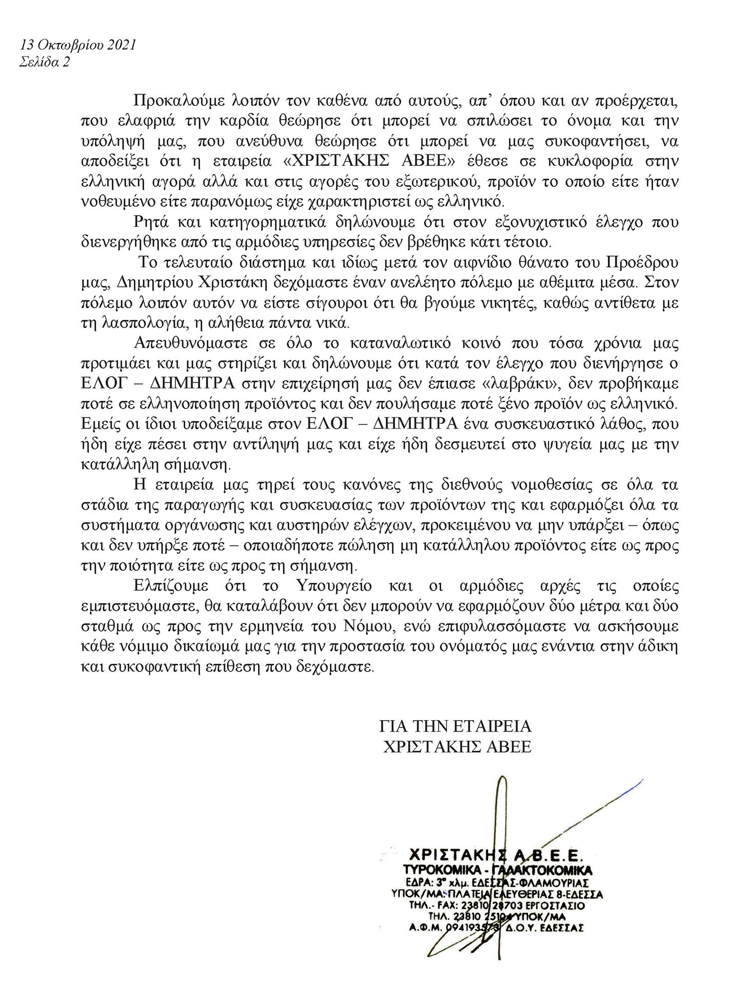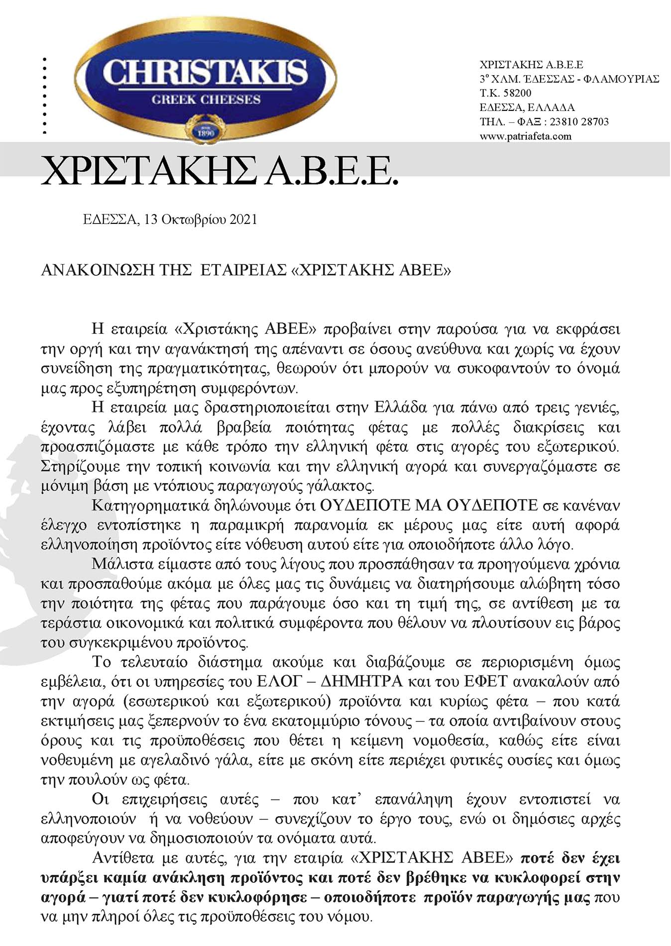Όπως αναδημοσιεύσαμε χθές, σύμφωνα πάντα με την ανακοίνωση του Υπουργείου Αγροτική Ανάπτυξης και τροφίμων, η εταιρεία Χριστάκης οδηγήθηκε στην εισαγγελία για «ελληνοποίηση» 7,7 τόνων βουλγάρικου τυριού. Η εταιρεία πριν από λίγο μας έστειλε την παρακάτω απαντητική επιστολή όπου ξεκαθαρίζει ότι ποτέ δεν κυκλοφόρησε το προϊόν αυτό στην Ελληνική αγορά και θεωρεί ότι συκοφαντείται το όνομά της. Εμείς βέβαια δεν γνωρίζουμε τι ισχύει αλλά επειδή το δημοσιεύσαμε το γεγονός απλά δείχνουμε και την αντίθετη πλευρά.