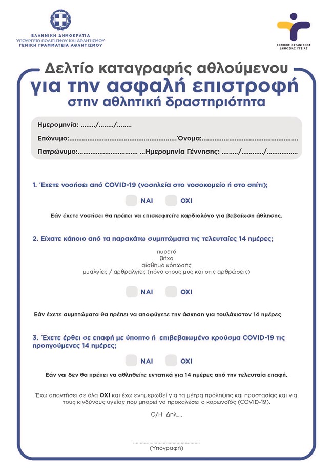 Το δελτίο καταγραφής αθλουμένου υπάρχει ηλεκτρονικά διαθέσιμο όπως επίσης και οι σχετικές οδηγίες προς αθλούμενους πολίτες για ασφαλή άσκηση σε οργανωμένες αθλητικές εγκαταστάσεις που έχουν αναρτηθεί στην ιστοσελίδα της Γενικής Γραμματείας Αθλητισμού (https://gga.gov.gr/component/content/article/278-covid/2981-covid19-sports) στην ενότητα "Οδηγίες Υγειονομικής Επιστημονικής Επιτροπής ΓΓΑ περί ασφαλούς άσκησης σε οργανωμένους αθλητικούς χώρους".