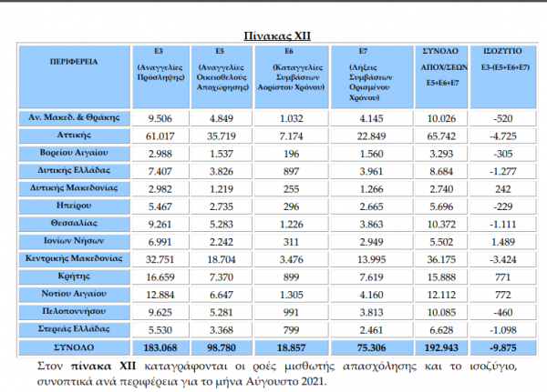 Συγκεκριμένα, σύμφωνα με τα στοιχεία των ροών μισθωτής απασχόλησης του Αυγούστου 2021, οι αναγγελίες πρόσληψης ανήλθαν σε 183.068, ενώ οι αποχωρήσεις σε 192.943.