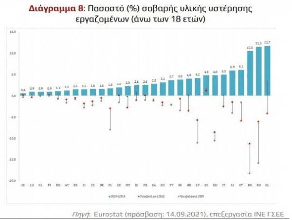 Είναι ενδεικτικό ότι, το 2020, το ποσοστό των πολιτών, άνω των 18 ετών, που διαβιούσαν σε συνθήκες σοβαρής υλικής υστέρησης, διαμορφώθηκε στο 15,9%, ανακόπτοντας την τάση αποκλιμάκωσης του συγκεκριμένου δείκτη που καταγράφεται στη χώρα μας από το 2017 και μετά.