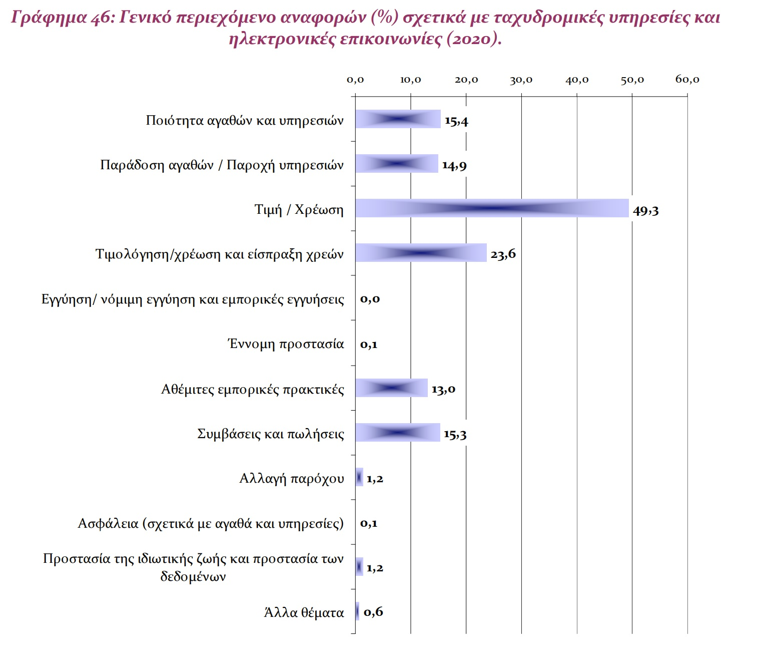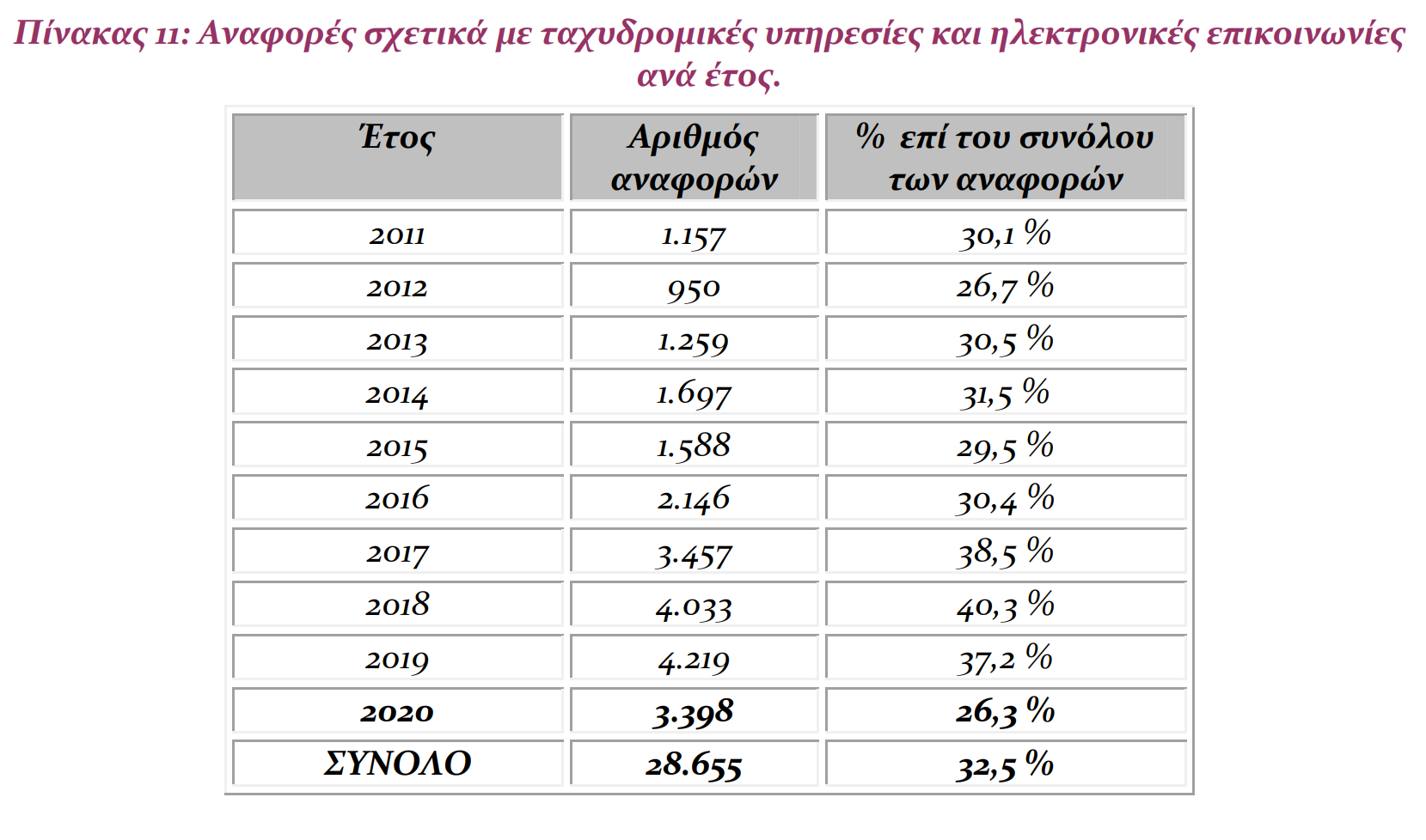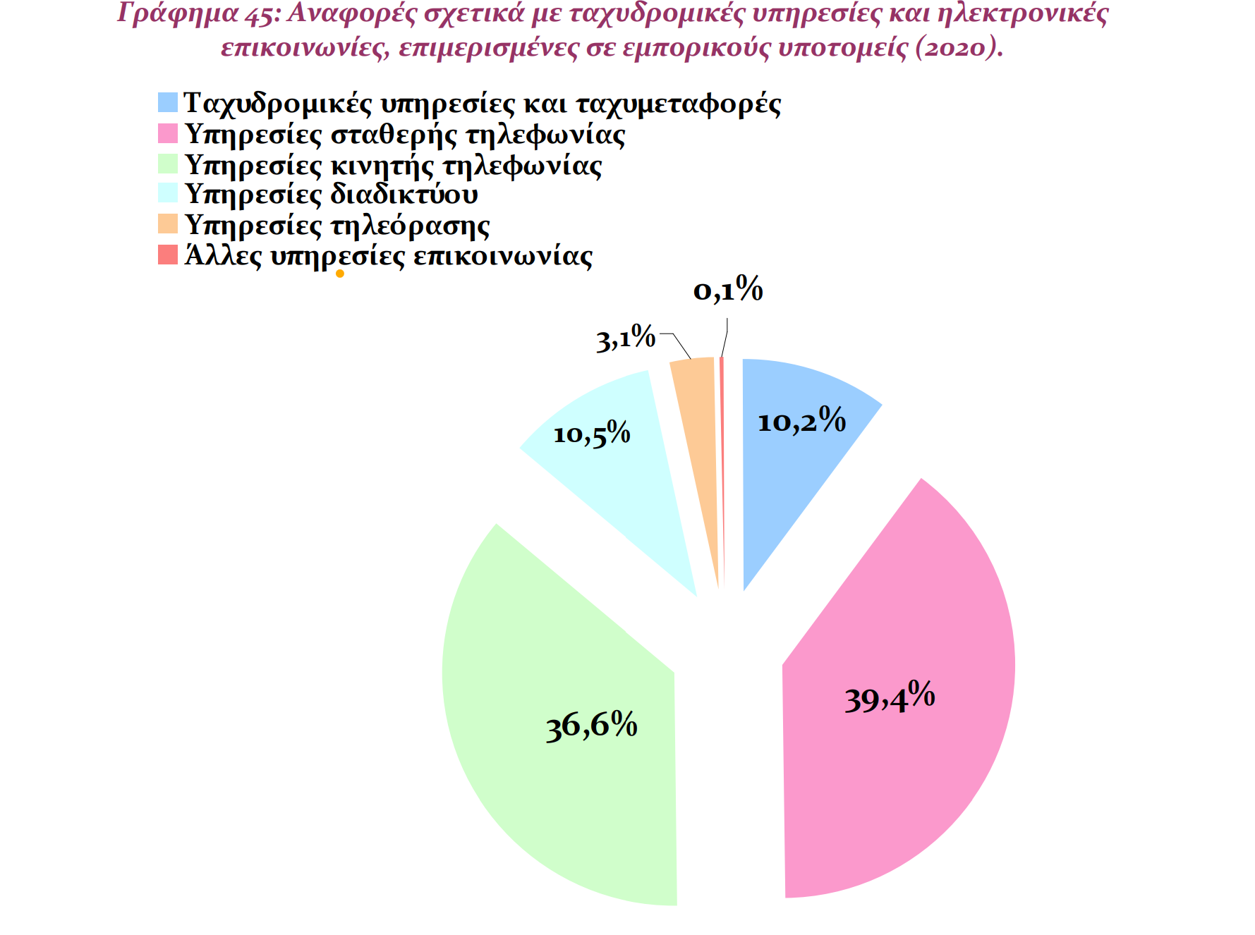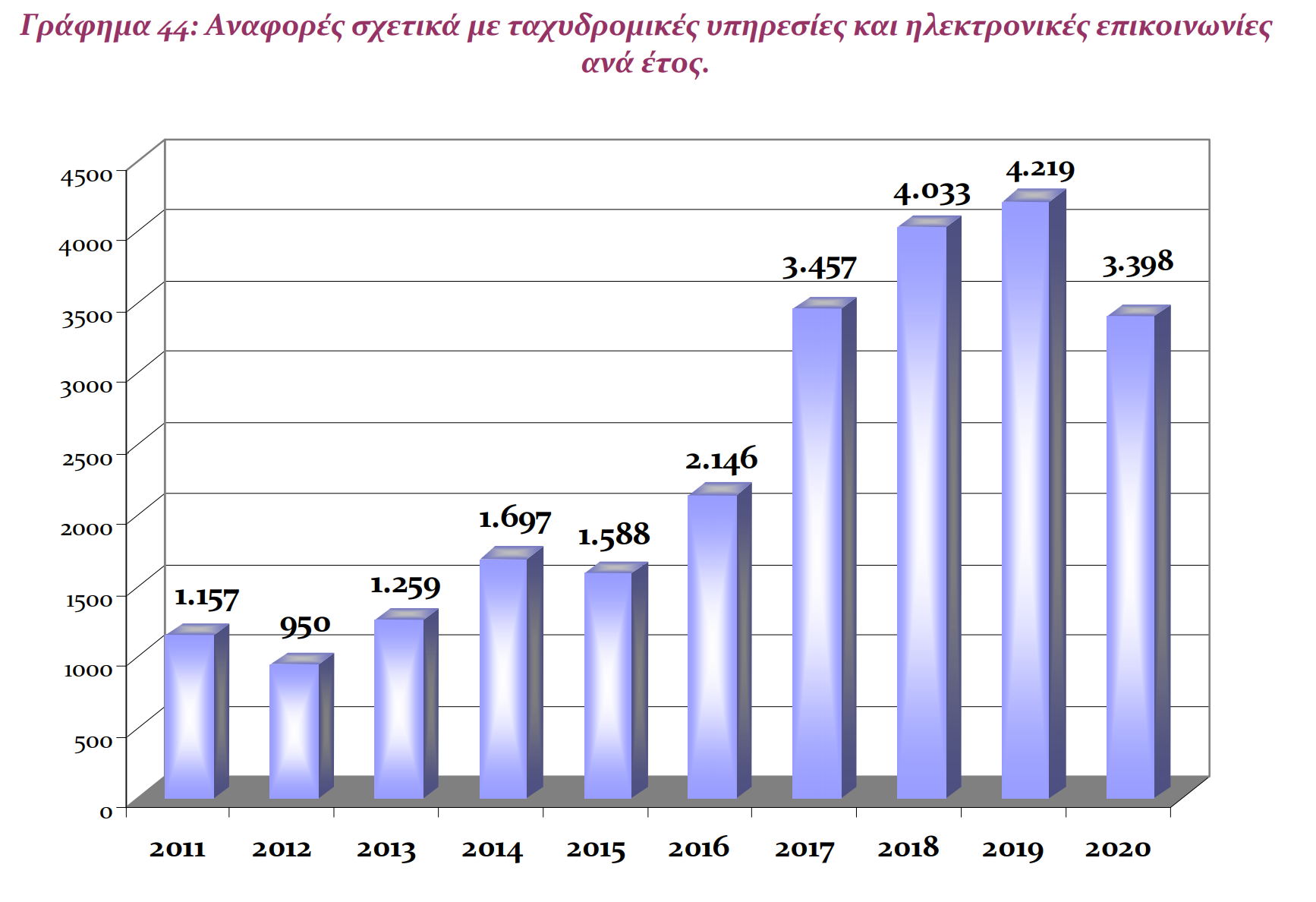 - Το 45% των αναφορών του 2020 κατά ταχυδρομικών επιχειρήσεων αφορά προβλήματα στην επίδοση ταχυδρομικών αντικειμένων (καθυστερήσεις).