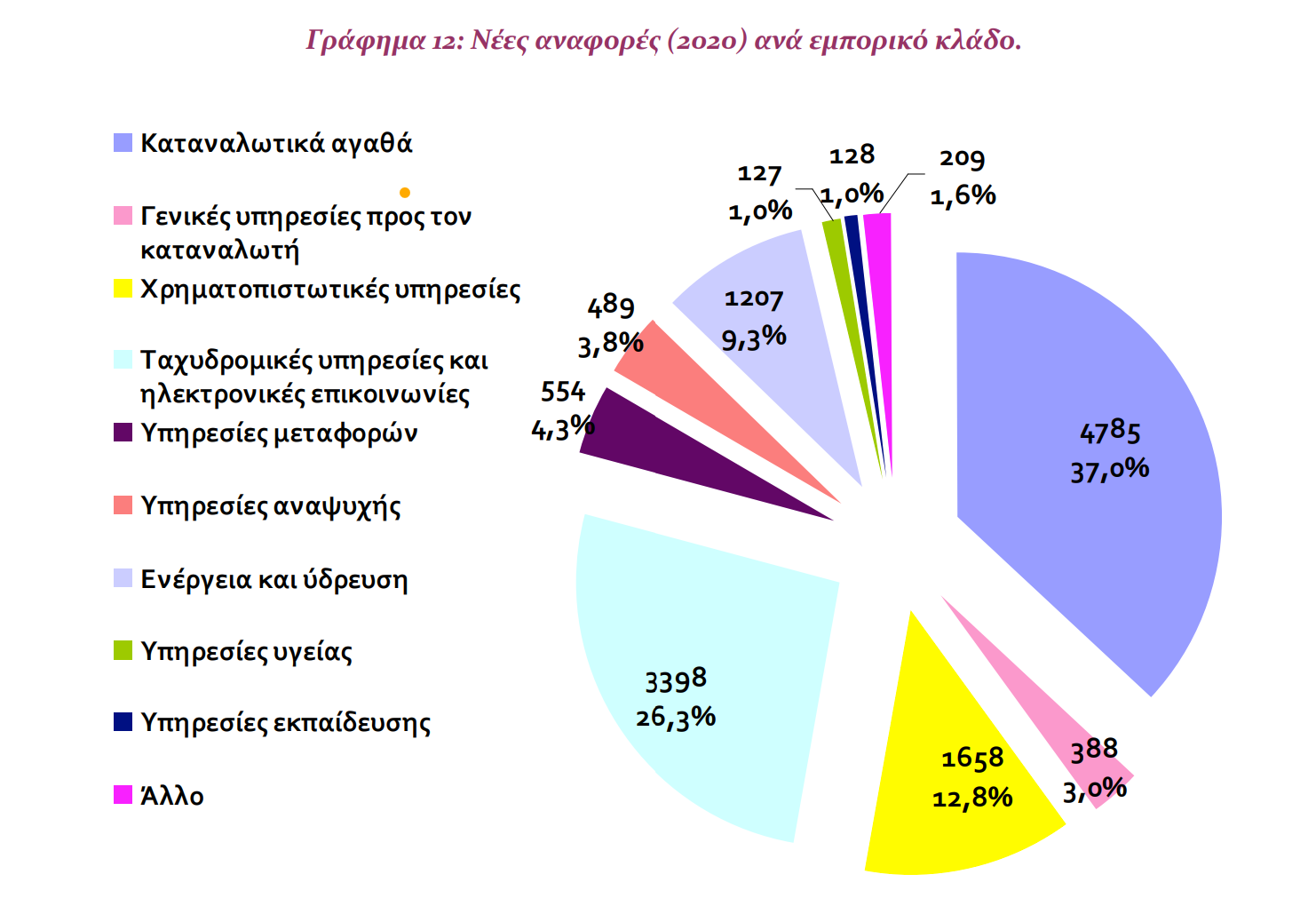 Οι κλάδοι με τις περισσότερες αναφορές, ως ποσοστό επί του συνόλου των αναφορών που υποβλήθηκαν στην Αρχή, είναι τα καταναλωτικά αγαθά (37%), οι ηλεκτρονικές επικοινωνίες-ταχυδρομικές υπηρεσίες (26,3%), οι χρηματοπιστωτικές υπηρεσίες (12,8%) και η ενέργεια-ύδρευση (9,3%).
