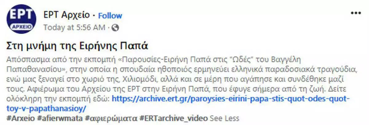 «Απόσπασμα από την εκπομπή «Παρουσίες-Ειρήνη Παππά στις “Ωδές” του Βαγγέλη Παπαθανασίου», στην οποία η σπουδαία ηθοποιός ερμηνεύει ελληνικά παραδοσιακά τραγούδια, ενώ μας ξεναγεί στο χωριό της, Χιλιομόδι, αλλά και σε μέρη που αγάπησε και συνδέθηκε μαζί τους. Αφιέρωμα του Αρχείου της ΕΡΤ στην Ειρήνη Παπά, που έφυγε σήμερα από τη ζωή», έγραφε το άλλο.