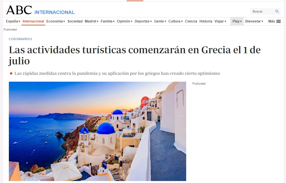 Στην ηλεκτρονική έκδοση της ισπανικής εφημερίδας ABC δημοσιεύεται ρεπορτάζ της ανταποκρίτριάς της στην Αθήνα, Begoña Castiella, με τίτλο: «Έναρξη της τουριστικής δραστηριότητας στην Ελλάδα την 1η Ιουλίου» και υπότιτλο: «Η έγκαιρη λήψη μέτρων κατά της πανδημίας και η τήρησή τους από τους Έλληνες, δημιουργούν σχετικά αισιόδοξο κλίμα».