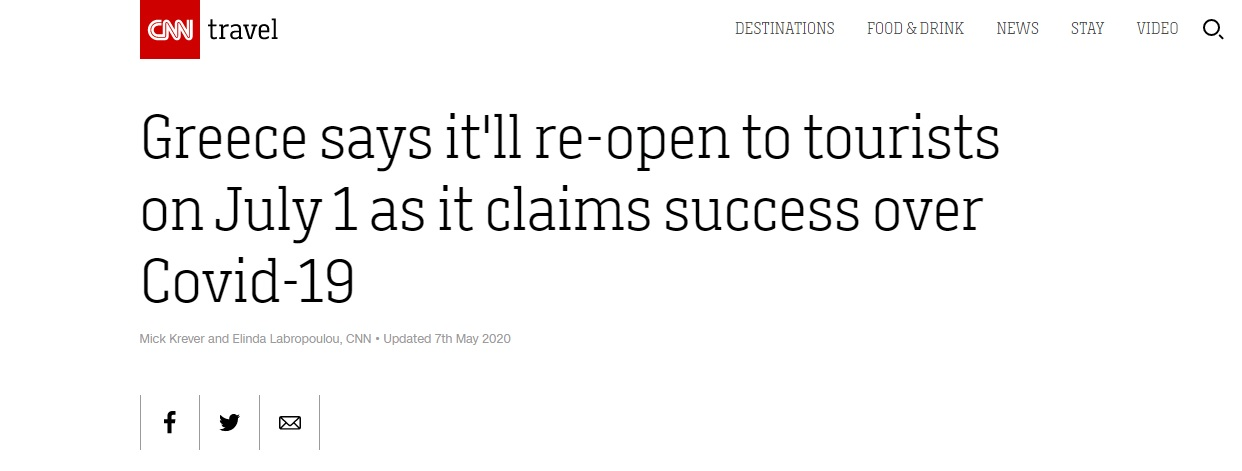 Και συνεχίζει: «Ο Κυριάκος Μητσοτάκης, έχει ήδη ορίσει μια συγκεκριμένη ημερομηνία κατά την οποία θα ήθελε να καλωσορίσει ξανά ξένους τουρίστες στην Ελλάδα. “Στο καλύτερο σενάριο, θα ανοίξουμε ξανά την 1η Ιουλίου”, είπε σε συνέντευξή του στο CNN. “Εργαζόμαστε προς αυτό.” Η Αθήνα ελπίζει για μια ευρωπαϊκή λύση. Η ελληνική κυβέρνηση ελπίζει ότι οι χώρες της ΕΕ θα συμφωνήσουν σύντομα σε έναν κοινό οδικό χάρτη».