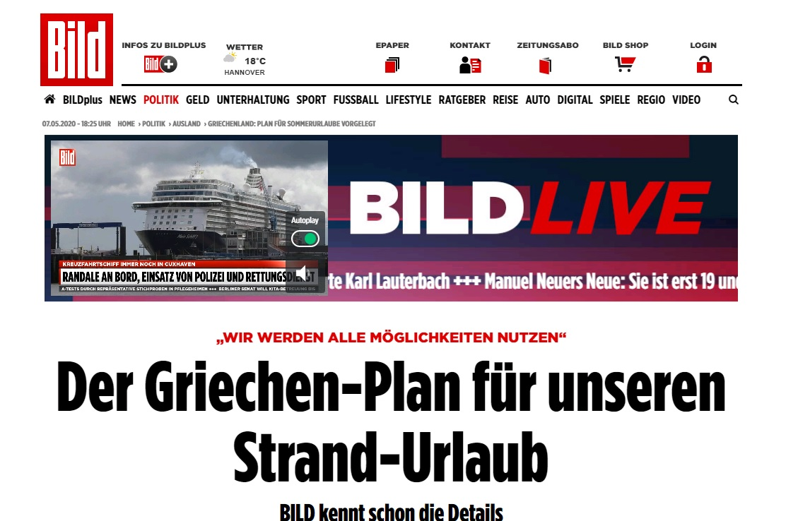 Η γερμανική tagesschau αφιερώνει χώρο, επίσης, στην τουριστική Ελλάδα και στις δηλώσεις του Κυριπακου Μητσοτάκη στο CNN για «άνοιγμα» της χώρας από τον Ιούλιο. «Η Ελλάδα τα έχει βγάλει πέρα/ έχει γλιτώσει μέχρι στιγμής την κρίση και σύντομα και θα αφήσει τους τουρίστες να επιστρέψουν στη χώρα. Για να αποφευχθούν οι πολυσύχναστες παραλίες, η Αθήνα επιβάλλει όρους – και ελπίζει για ένα ευρωπαϊκόχρονοδιάγραμμα. Η Ελλάδα επιστρέφει αργά στο φυσιολογικό μετά την πρώτη χαλάρωση των μέτρων» αναφέρεται στο δημοσίευμα.