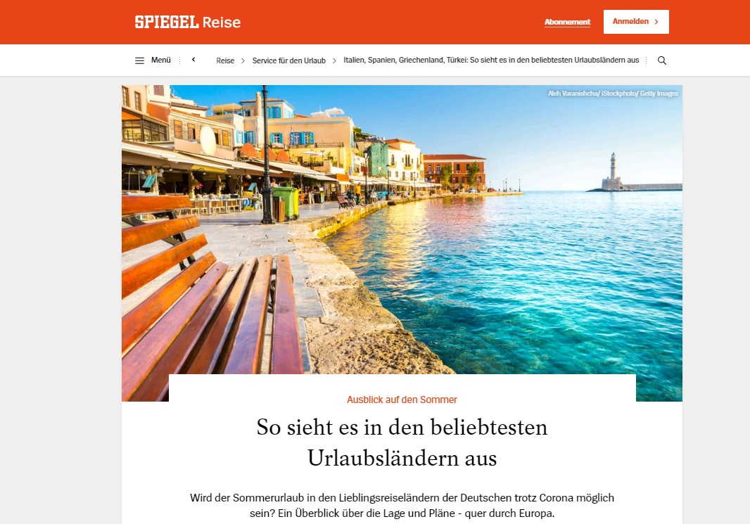 Στην ιστοσελίδα του γερμανικού περιοδικού Spiegel και στη στήλη «Ταξίδια» φιλοξενείται εκτενές ρεπορτάζ που επιχειρεί να σκιαγραφήσει την κατάσταση σε δημοφιλείς παραθεριστικούς προορισμούς για τους Γερμανούς τουρίστες, όπως αυτή διαμορφώνεται με τη σταδιακή υποχώρηση των περιορισμών για την ανάσχεση της πανδημίας του κορωνοϊού.