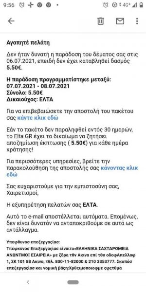 Συγκεκριμένα, τα Ελληνικά Ταχυδρομεία ενημερώνουν ότι δεν αποστέλλουν μηνύματα ηλεκτρονικού ταχυδρομείου (e-mail) ή μηνύματα κινητής τηλεφωνίας (sms) στους πελάτες τους, μέσω των οποίων ζητούν στοιχεία τραπεζικού λογαριασμού ή πιστωτικής κάρτας, με σκοπό την παράδοση κάποιου δέματος.