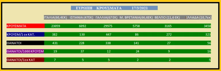Είναι χαρακτηριστικό ότι η χώρα μας είχε χθες 323 κρούσματα ανά ένα εκατομμύριο πληθυσμού, όταν στην Μ. Βρετανία είχε 86, η Ισπανία 130, το Βέλγιο 272 και μόνο η Ιταλία (382) κι η Γαλλία (447) έχουν αριθμούς σχετικά μεγαλύτερους από την χώρα μας. Επίσης, πλέον, η χώρα μας είχε το τελευταίο 24ωρο πέντε θανάτους ανά 1.000.000 κατοίκους όταν στο Βέλγιο και την Μ. Βρετανία (όπου υπήρχε κι η επικίνδυνη μετάλλαξη) έχουν περιορισθεί στους δύο με το ίδιο πληθυσμιακό δείγμα. Η Ελλάδα έχει την ίδια θνησιμότητα με την Ισπανία, την Γαλλία και μόνο η Ιταλία υπάρχει σχετικά μεγαλύτερος αριθμός ατόμων που χάνουν την ζωή τους.
