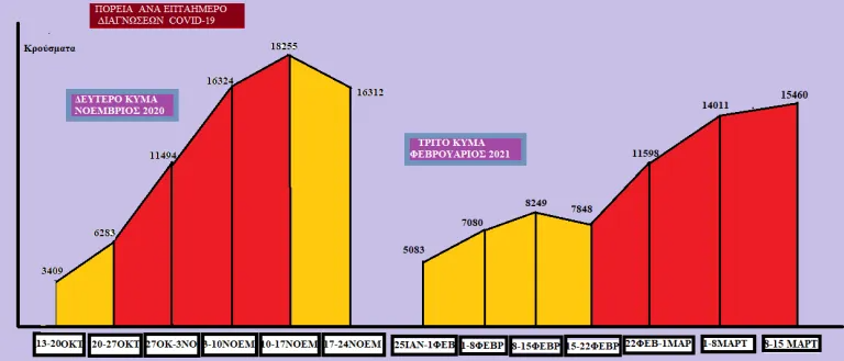 Επιπλέον, στις 18 Νοεμβρίου που επίσης υπήρχε ιδιαίτερα υψηλός αριθμός κρουσμάτων, δηλαδή 3.209, είχαν διενεργηθεί περίπου 31.000 έλεγχοι. Η αύξηση κάθε εβδομάδα του αριθμού των νέων νοσούντων σε αυτό το τελευταίο «κύμα» του covid-19 σύμφωνα με το αντίστοιχο γράφημα που παρουσιάζει «Το Βήμα», είναι μικρότερη εκείνης του προηγουμένου Νοεμβρίου. Δηλαδή στα μέσα Νοεμβρίου υπήρξε, μέσα σε τρεις εβδομάδες, αύξηση του αριθμού των κρουσμάτων κατά 191% όταν τις τρεις τελευταίες εβδομάδες η αύξηση είναι της τάξης του 96%, αφού βεβαίως υπεισέρχονται και τα θετικά δεδομένα από τους εμβολιασμούς.