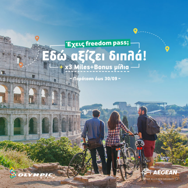 Από σήμερα, η AEGEAN παρατείνει την προσφορά της έως και 30/09/2021 συνεχίζοντας να διπλασιάζει την αξία του Freedom Pass για την αγορά εισιτηρίων για οποιαδήποτε πτήση εσωτερικού ή εξωτερικού του δικτύου της και για ταξίδια από 01/09/2021 μέχρι 26/03/2022, ενώ παράλληλα τριπλασιάζει τα Μiles+Bonus μίλια κάθε πτήσης για παλιούς και νέους δικαιούχους.