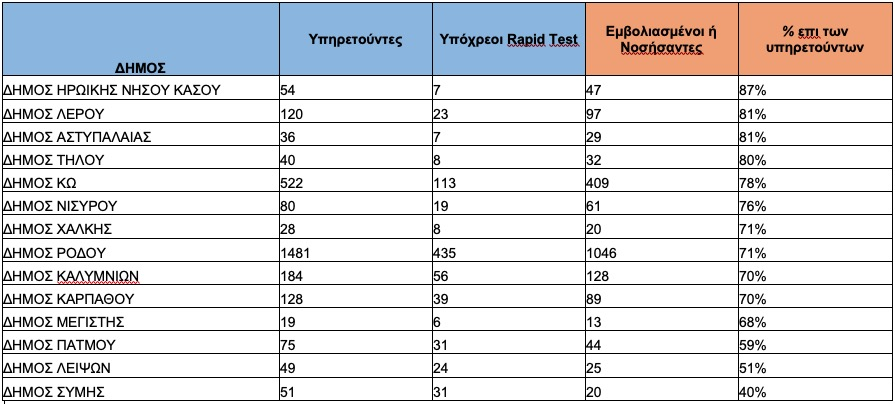Συγκεκριμένα, με βάση τα στοιχεία που έχει συλλέξει η Κεντρική Ένωση Δήμων Ελλάδος και επεξεργάστηκε σε συνεργασία με το Υπουργείο Εσωτερικών, από τους 108.913 εργαζόμενους που υπηρετούν στους 332 Δήμους, έχουν εμβολιασθεί ή νοσήσει οι 74.884 (ποσοστό 70%), ενώ 34.029 είναι υπόχρεοι στο να υποβάλλονται σε rapid test.