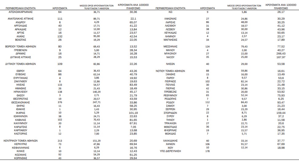 Ο συνολικός αριθμός των κρουσμάτων ανέρχεται σε 554.055 (ημερήσια μεταβολή +0.7%), εκ των οποίων 51.1% άνδρες.Με βάση τα επιβεβαιωμένα κρούσματα των τελευταίων 7 ημερών, 129 θεωρούνται σχετιζόμενα με ταξίδι από το εξωτερικό και 1.578 είναι σχετιζόμενα με ήδη γνωστό κρούσμα.