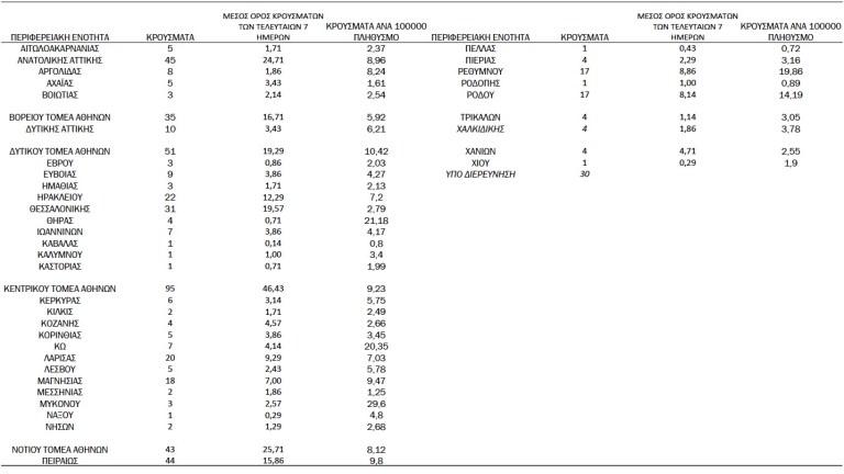 Κατανομή ανακοινωθέντων εγχώριων κρουσμάτων: Από το σύνολο των 605 νέων κρουσμάτων του νέου ιού στη χώρα 21 είναι εισαγόμενα εκ των οποίων 3 εντοπίστηκαν κατόπιν ελέγχων στις πύλες εισόδου της χώρας . Η κατανομή των 584 νέων εγχώριων κρουσμάτων ανά Περιφερειακή Ενότητα παρουσιάζεται στον κατωτέρω πίνακα: