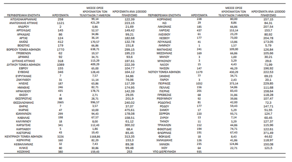 Ο συνολικός αριθμός των κρουσμάτων ανέρχεται σε 1.105.885 (ημερήσια μεταβολή +2.0%), εκ των οποίων 50.4% άνδρες. Με βάση τα επιβεβαιωμένα κρούσματα των τελευταίων 7 ημερών, 195 θεωρούνται σχετιζόμενα με ταξίδι από το εξωτερικό και 1.644 είναι σχετιζόμενα με ήδη γνωστό κρούσμα.